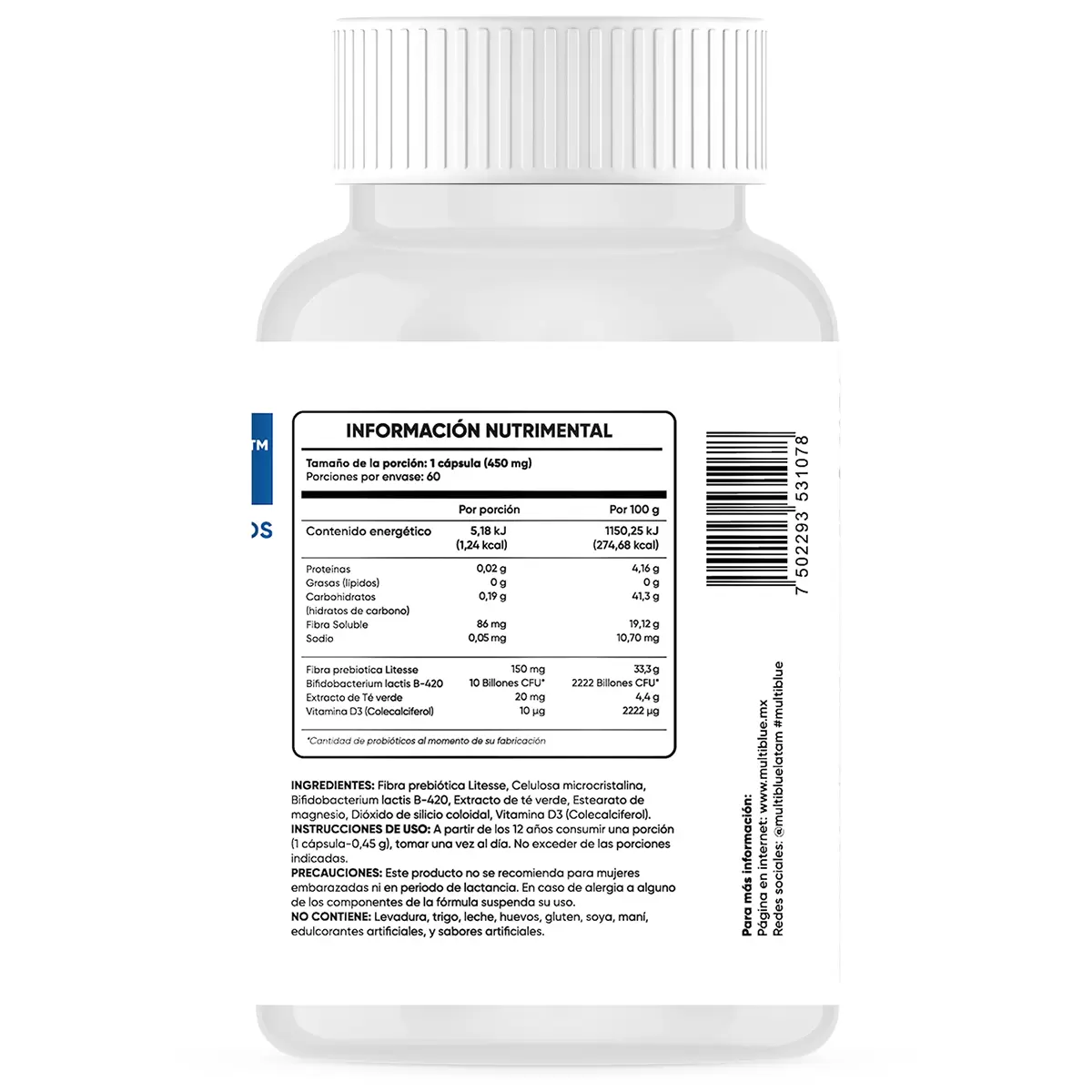 Each capsule delivers 60 billion CFUs (colony forming units) of the Bifidobacterium lactis B-420 strain, combined with Litesse prebiotic fiber, green tea extract, and vitamin D3. Together, these ingredients form a synbiotic blend designed to: