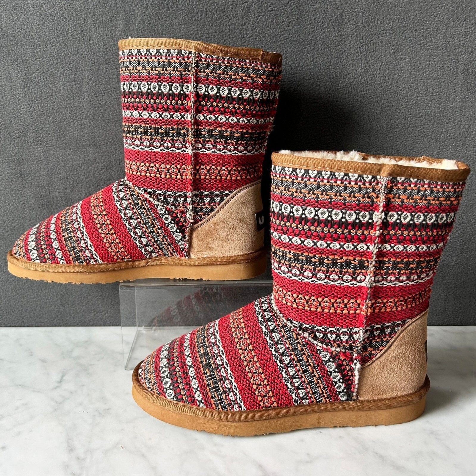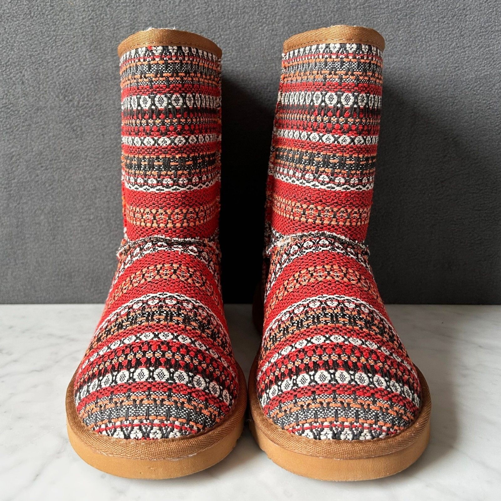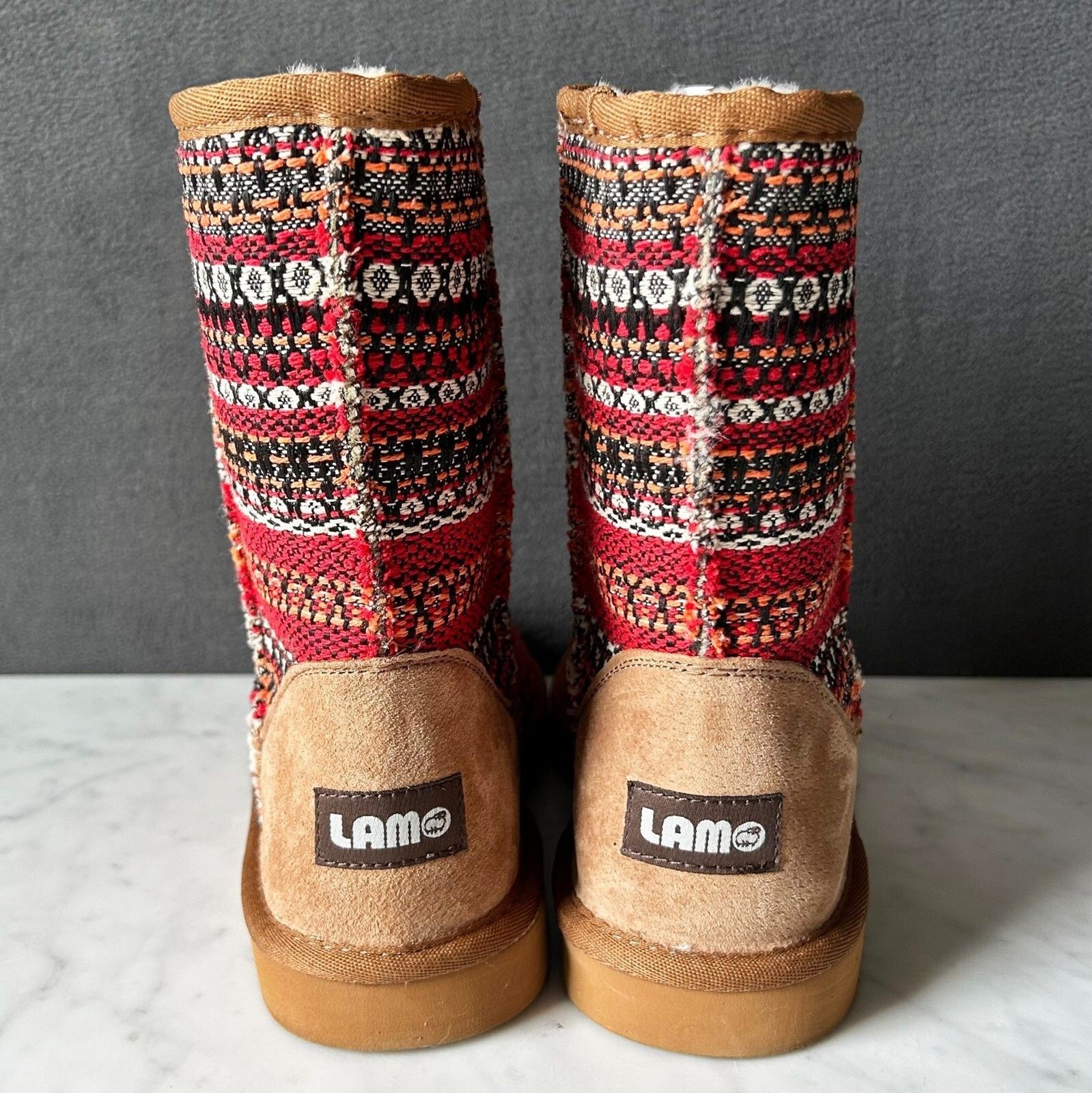Lamo women's size 9 Juarez ankle boot is NEW in box. Sonoran Collection red striped textile upper with suede leather heel counter. Warm faux fur lining and insole. Durable TPR outsole so you can wear these comfortable pull-on boots inside and outdoors.