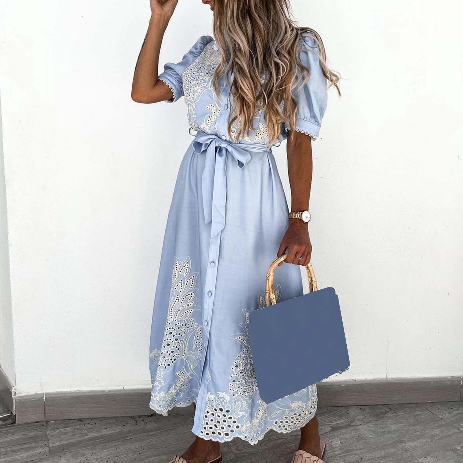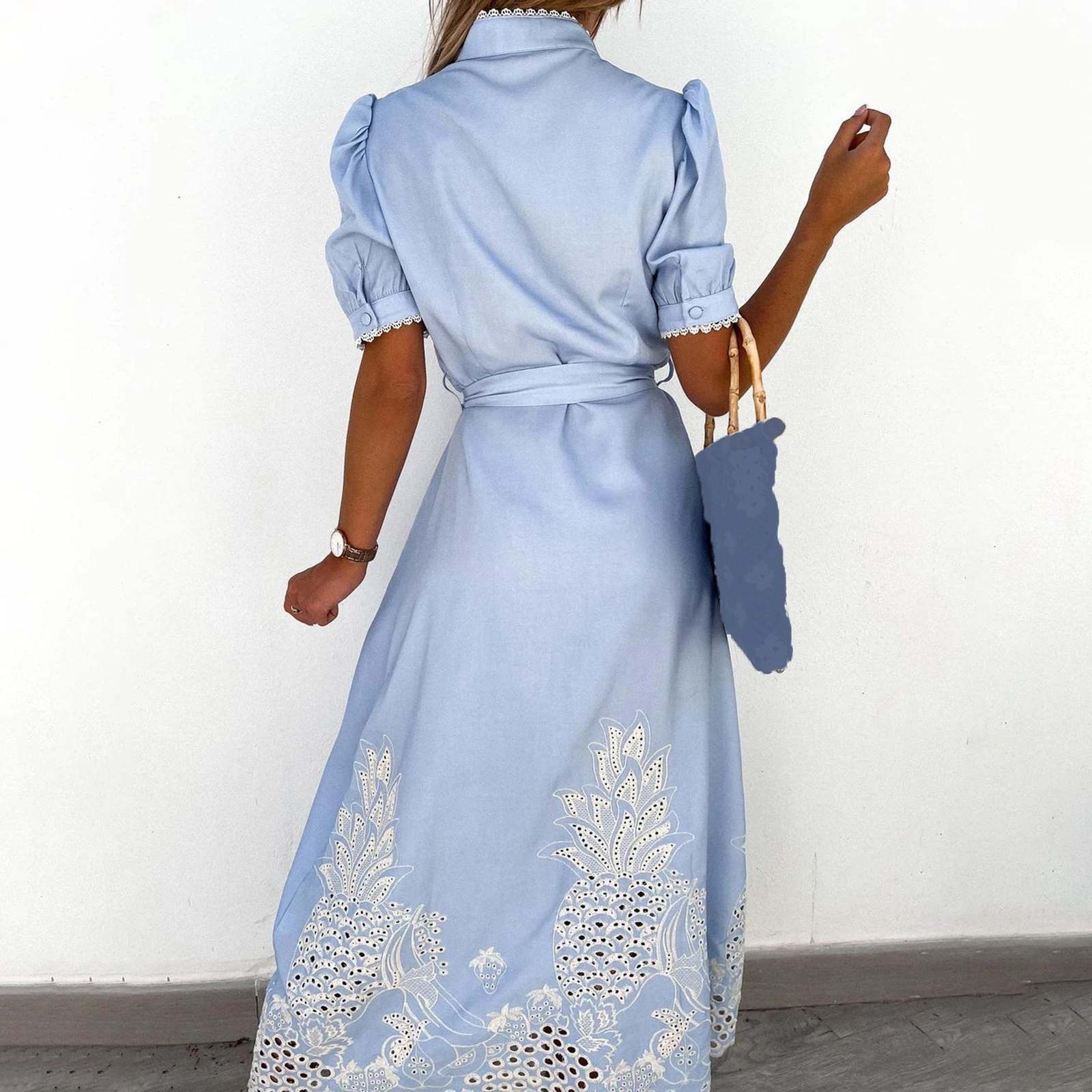 Hollow Embroidery Elegant Semi-turtleneck Short Sleeves Spring Summer Dress