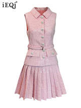 Tweed Sequins Spliced Lapel Lace-up Sleeveless Belt Coat Pleated Mini Skirts Set
