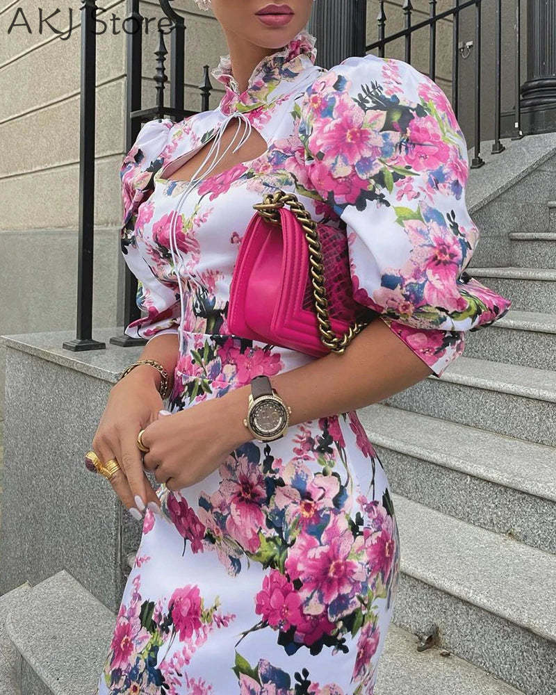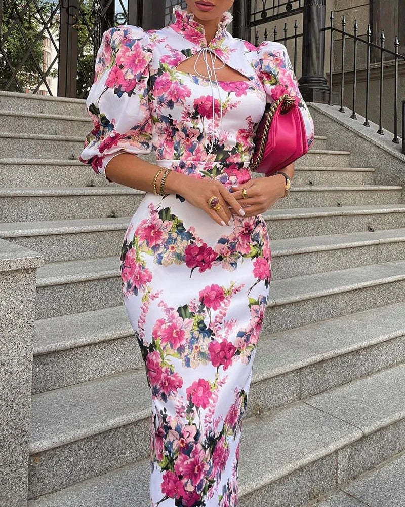 Puff Sleeve Floral Print Frill Hem Cutout Tied Detail Dress