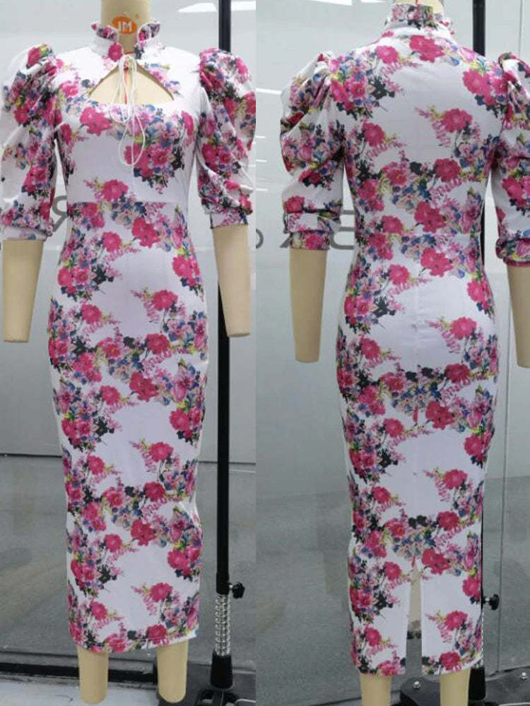 This elegant dress features a slim sheath silhouette with a mid-calf length, crafted from slightly stretchy polyester for comfortable wear. Designed with a floral pattern and a half-open neckline, it offers a refined casual style perfect for autumn. The full-length puff sleeves and empire waistline enhance its sophisticated appeal, while a discreet zipper closure ensures a seamless fit. Ideal for women seeking a graceful yet modern look.
