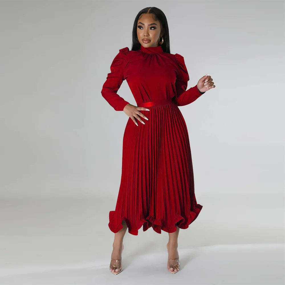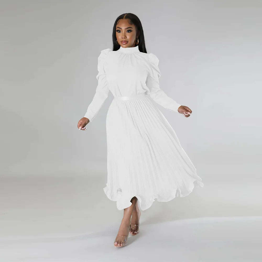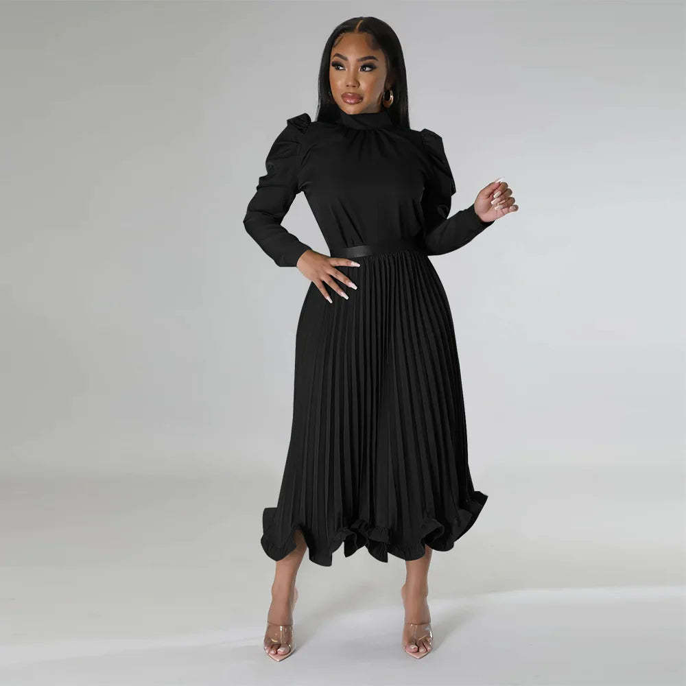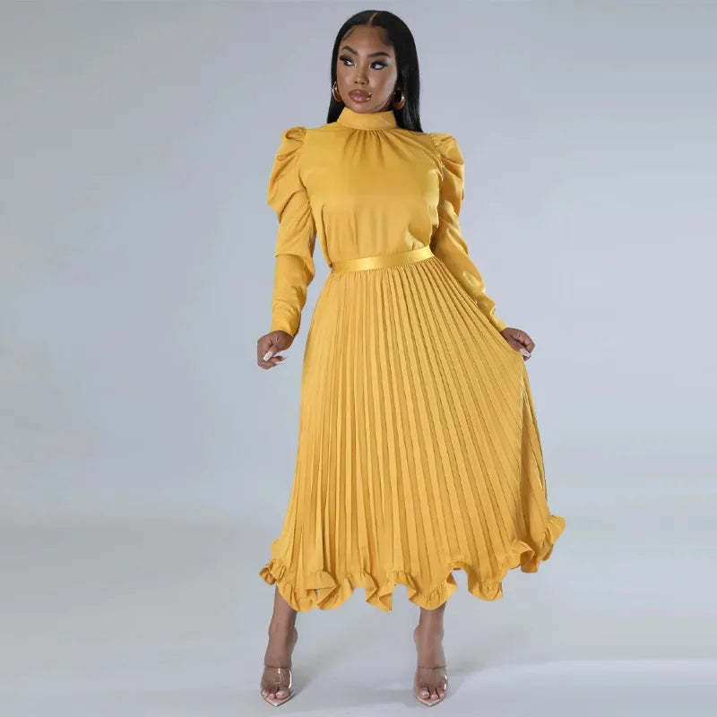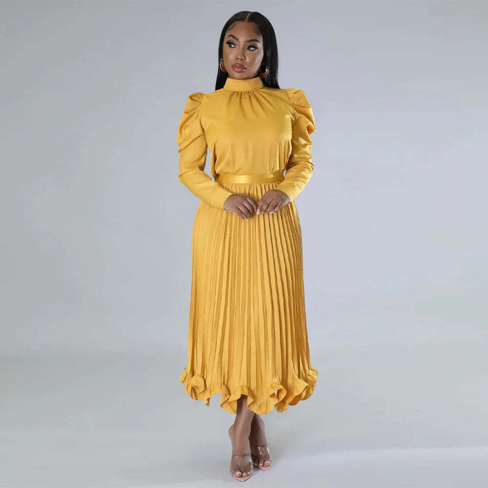 This elegant two-piece plus size evening dress features a high neck and a pleated design for a refined silhouette. Crafted from medium-stretch polyester, it offers a comfortable slim fit with a natural waistline. The three-quarter shrug sleeves and sash detail add a subtle touch of sophistication. Designed for summer, this A-line dress with a scarf collar combines casual style with timeless elegance. Perfect for any upscale event or party.