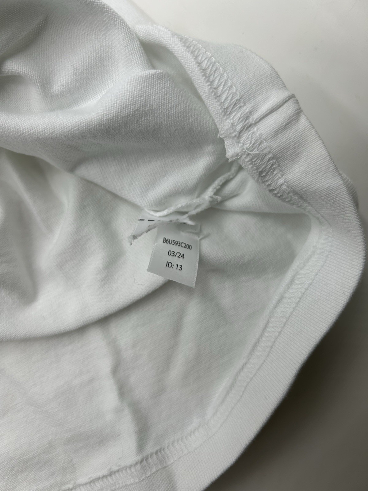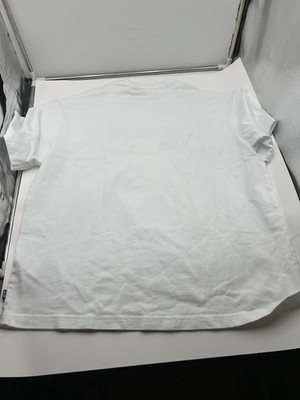 The product is a Men's All White Box Logo Crew Short Sleeve T-Shirt from Psycho Bunny in size Large. Made from cotton, this classic fit T-shirt features a solid white color with a bunny character and logo accents. The crew neck design makes it easy to wear and care for with machine washable instructions. Perfect for men looking for a stylish and comfortable shirt to add to their wardrobe.