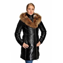 Sleek-stylish down filled leather parka featuring a Raccoon fur trimmed hoodie lined with rabbit fur. Perfect coat to take the cool temps.