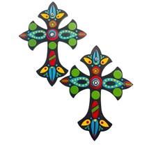 Vibrant pair of hand-painted wall crosses featuring bold folk-art patterns in red, yellow, blue, and green on a matte black background. Each cross includes a small metal or rhinestone accent in the center for extra charm. Perfect for adding a pop of color and faith-inspired art to any room, especially boho, rustic, or Southwestern decor styles.