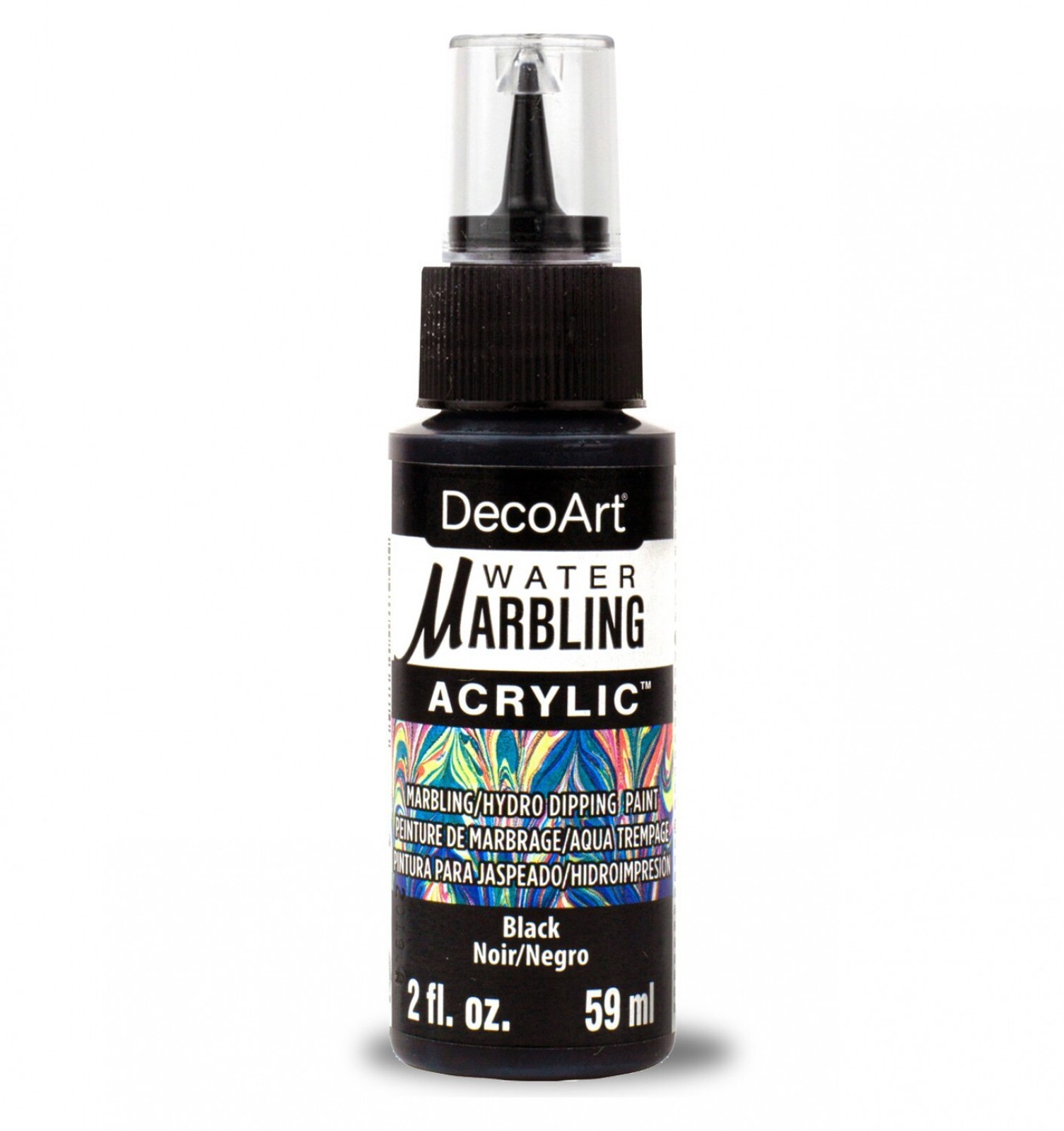DecoArt Water Marbling Acrylic Black Paint 2oz. Water marbling is the ancient art form of using paint on the surface of the water to create mesmerizing patterns. DecoArt Water Marbling Acrylics are perfect for any level of artist to create custom artwork or designs! By putting DecoArt Water Marbling Magic Medium in a pool of water you can then use our Water Marbling Acrylics to create unique designs directly on the water?s surface. With water marbling - also known as hydro dipping - no two designs will be alike, the surprise and unique quality of each design is part of the magic and mystique of this ancient art form. Ready-to-use, vibrant acrylics in a dropper tip squeeze bottle that allow color to be dropped onto the surface of the water with complete control. Sold individually.