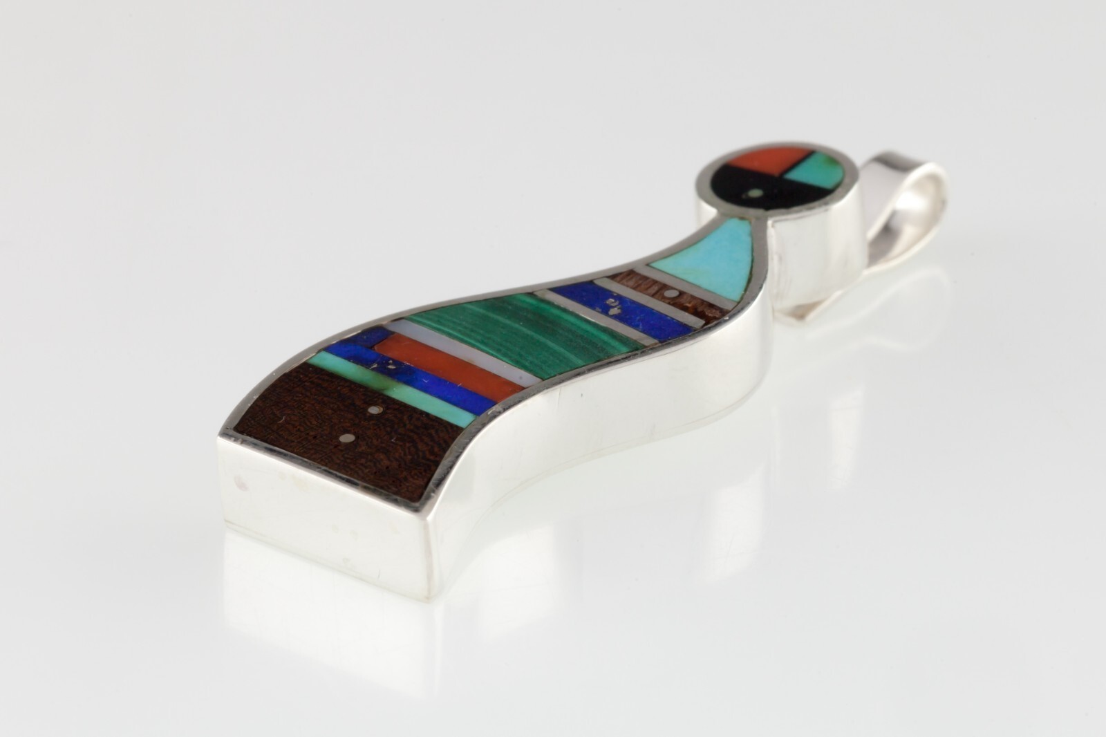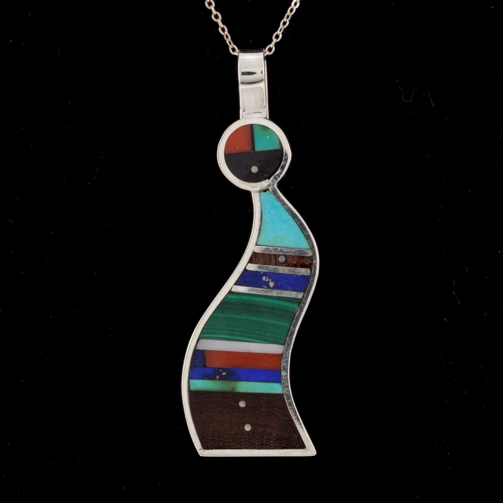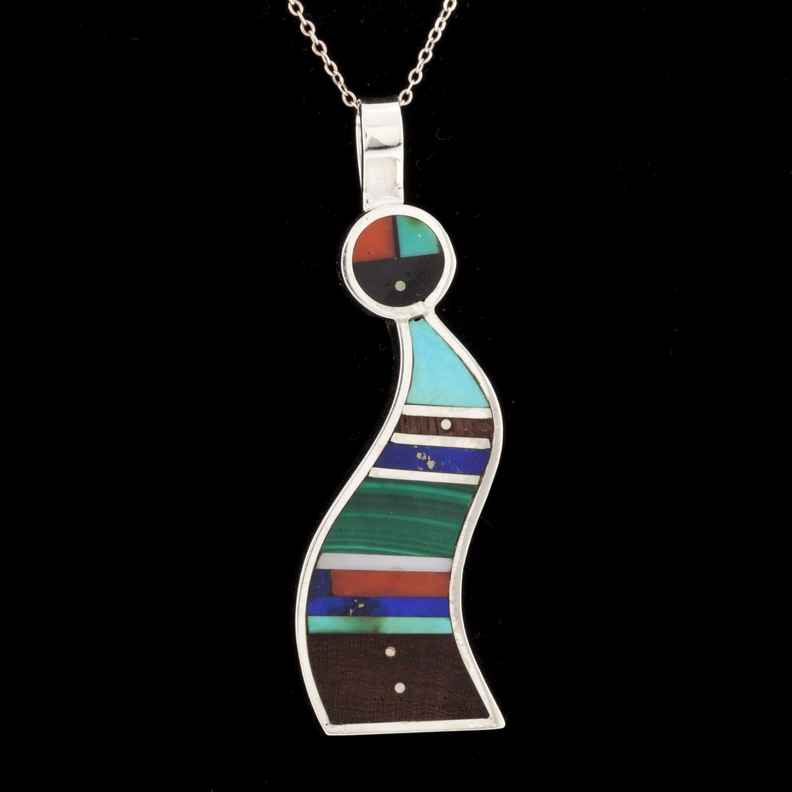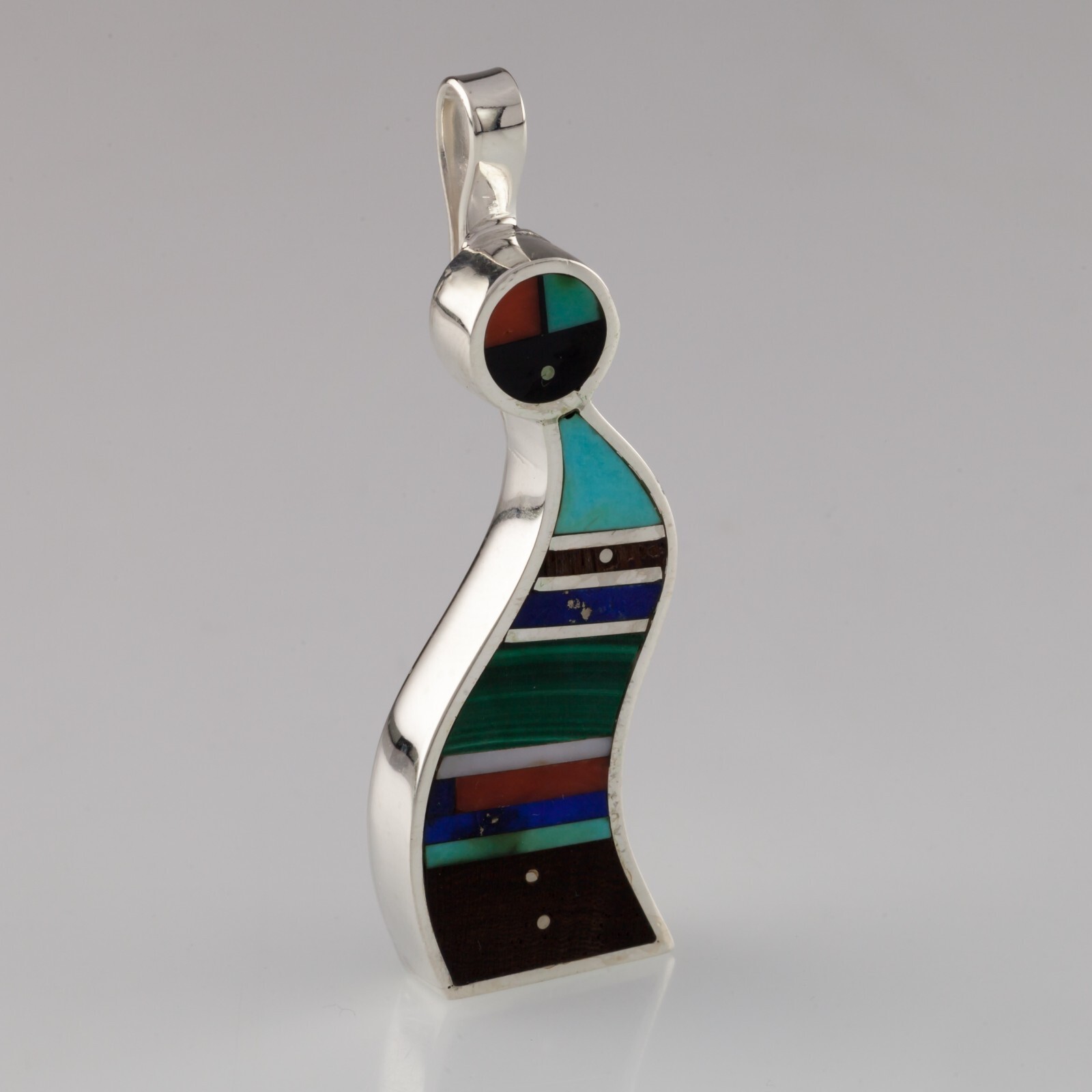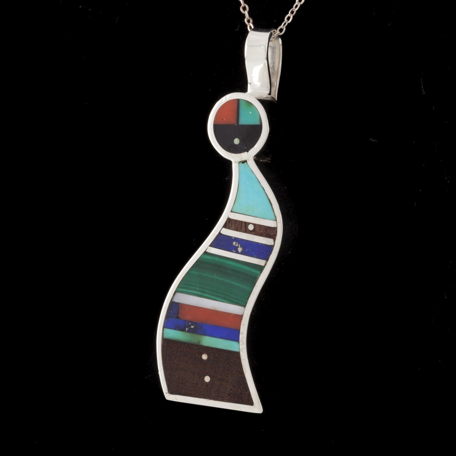 Unique Harold Smith Sterling Pendant with Jet, Turquoise, Lapis and Malachite inlayed in figure
