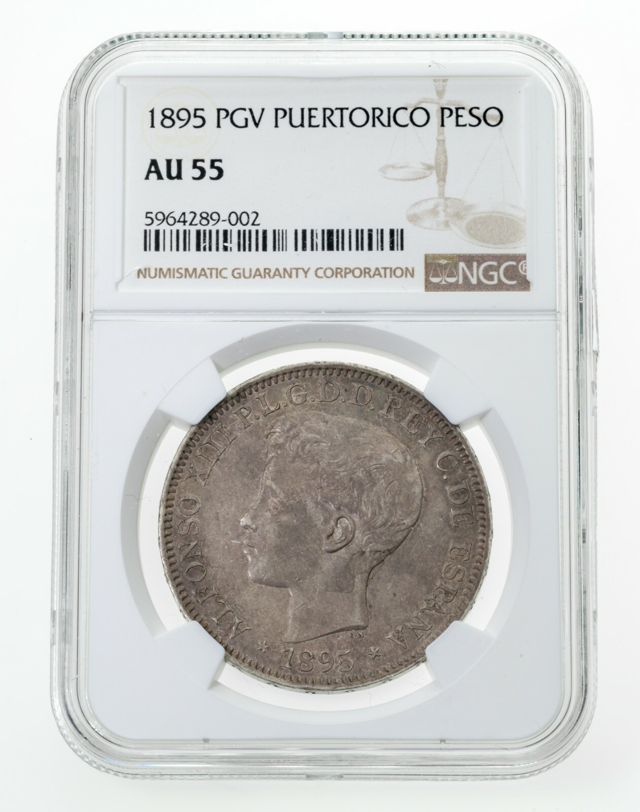 1895 PGV Puerto Rico Peso Silver Coin Graded AU-55 By NGC KM# 24
