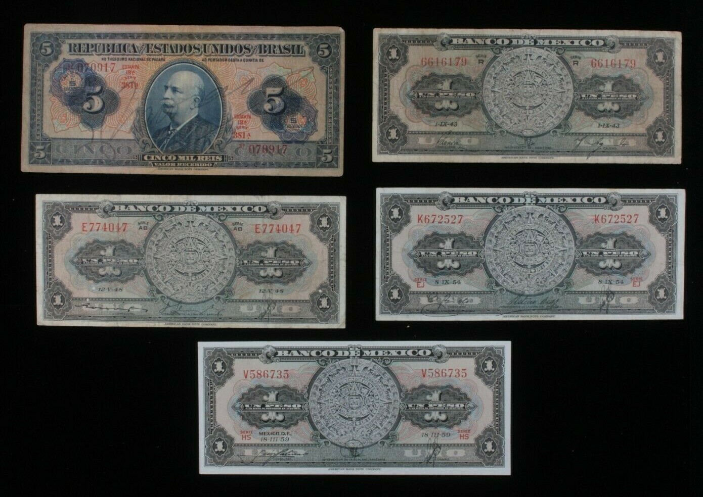 1942-1959 Brasile & Messico 5-Notes Currency Lotto Cruzeiros & Pesos