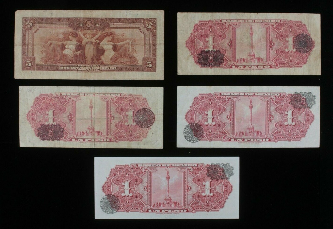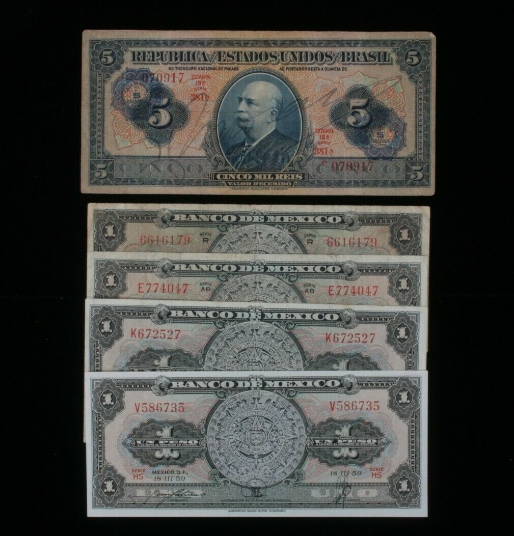 1942-1959 Brasile Messico 5-Notes Currency Lotto Cruzeiros Pesos