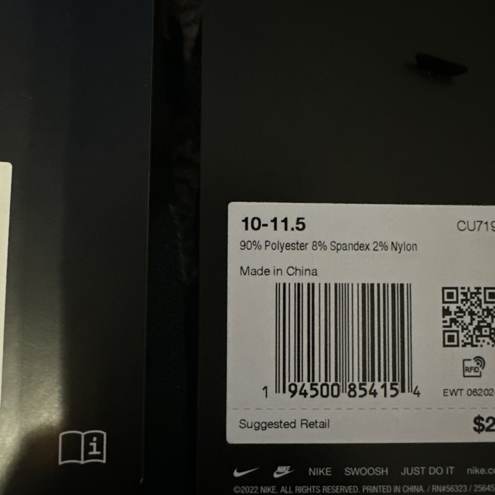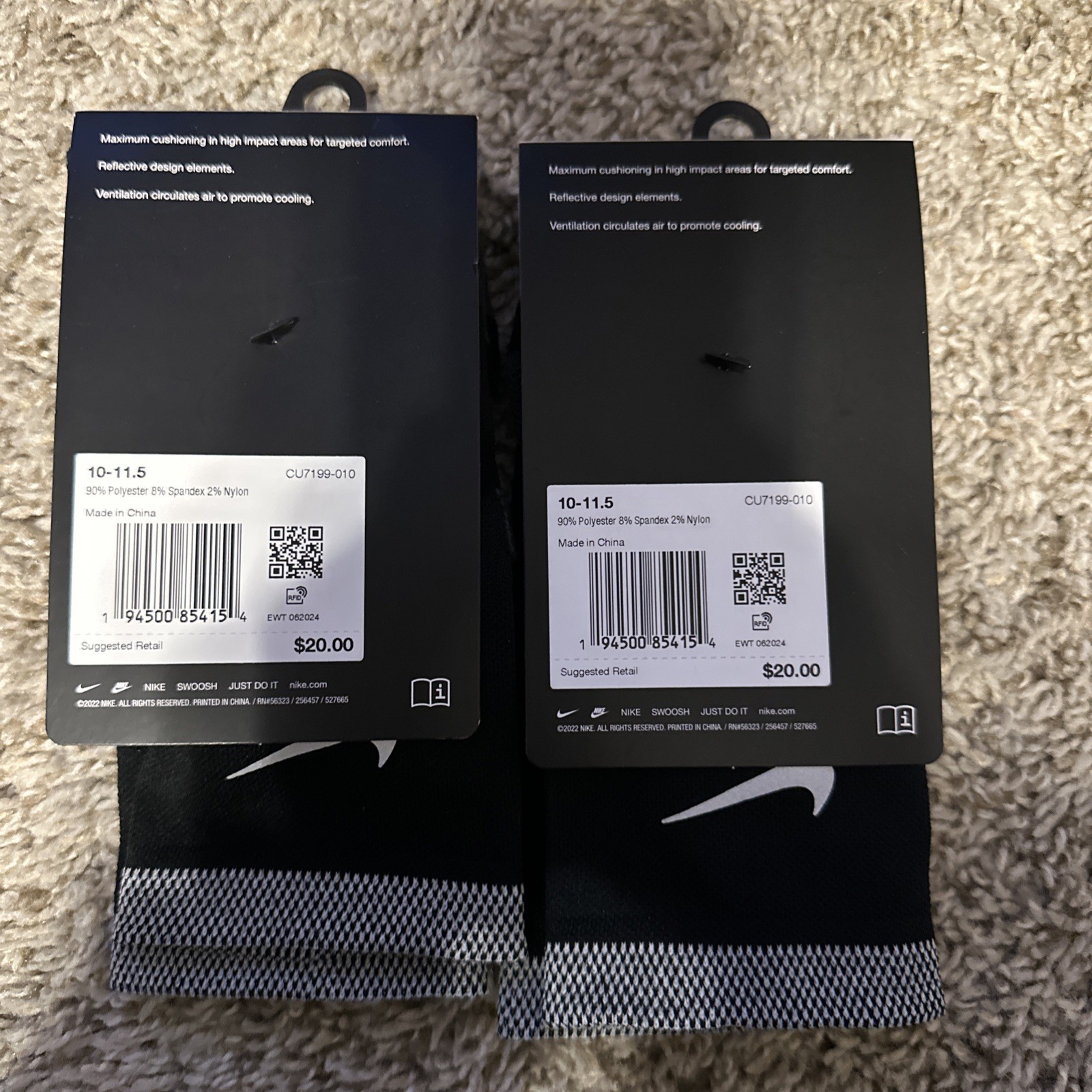 The product is a pair of new Nike Dri-FIT Spark cushioned ankle running socks in size M 10-11.5/W 11.5-13. These socks are designed with a solid black color and are made from a blend of polyester, nylon, and spandex. They feature a cushioned design for added comfort during running and jogging activities. With a pack of 2 pairs, these athletic socks from Nike are ideal for unisex adults looking for high-quality performance socks.