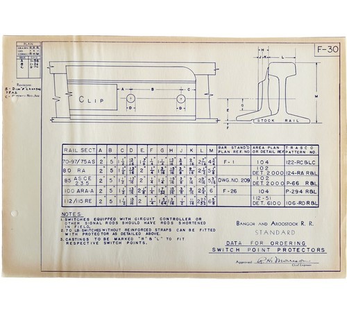 1956 Railroad Bangor Aroostook Switch Point Protector Data Blueprint F30 DWDD14