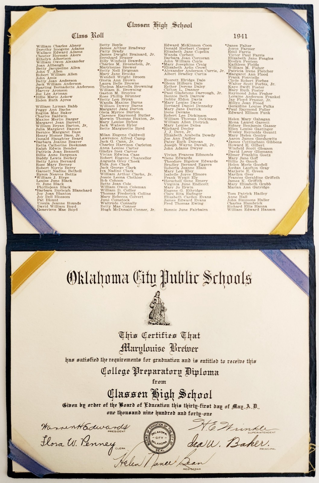 1941 Classen High School Oklahoma City Graduation Diploma Marylouise Brewer C99