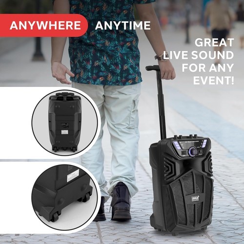 * RECHARGEABLE BATTERY: Perfect for karaoke, stage performances, and crowd control, this Pyle portable Bluetooth speaker is fully portable with a built-in 3.7V, 3600mAh rechargeable battery. It also features rolling wheels for easy transport.