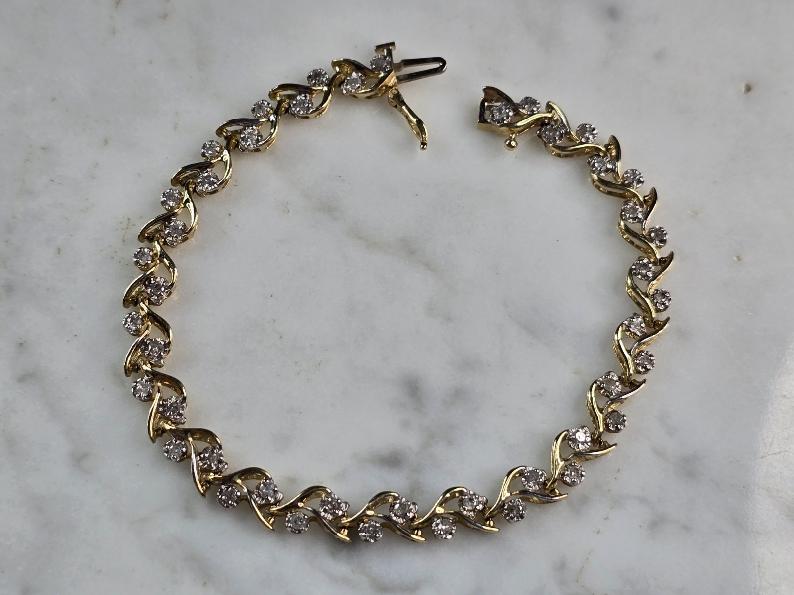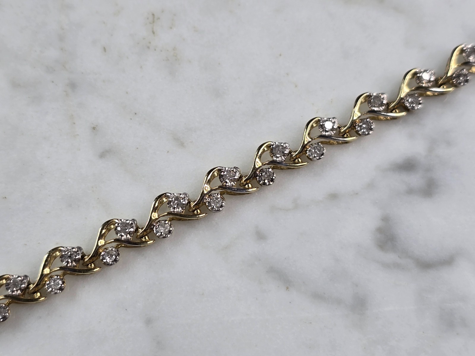 A WOMENS VINTAGE ESTATE 10K WOMENS TENNIS BRACELET. THE BRACELET MEASURES 7 1/8" LONG BY 1/4" WIDE, AND WEIGHS 7.3g. THERE ARE 44 TINY DIAMONDS IN THIS BRACELET. WOULD MAKE A GREAT GIFT FOR THAT SPECIAL SOMEONE. ANY QUESTIONS PLEASE DO NOT HESITATE TO ASK. BE SURE TO CHECK OUT SOME OF MY OTHER GREAT ITEMS UP FOR SALE. THANK YOU.