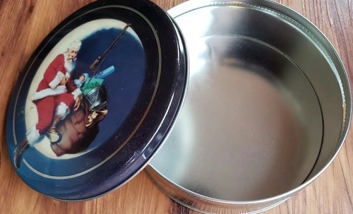 Vintage ~ 8" Dia. x 3" Tall ~ Santa Claus Theme ~ Metal Tin ~ Sewing Box ~ Etc.