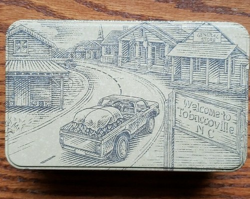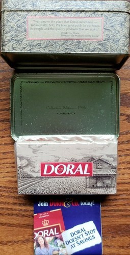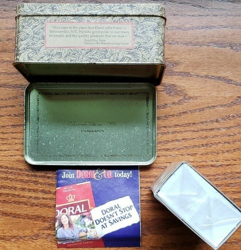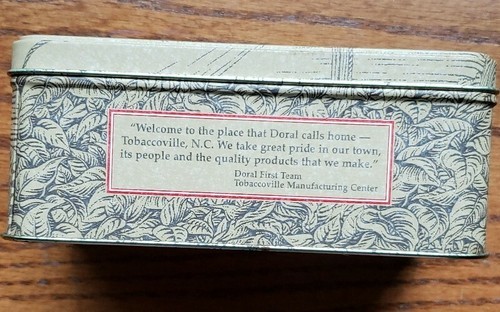 Tin reads..."Welcome to the place that Doral calls home ~ Tobaccoville, N.C. We take great pride in our town, its people and the quality products that we make."