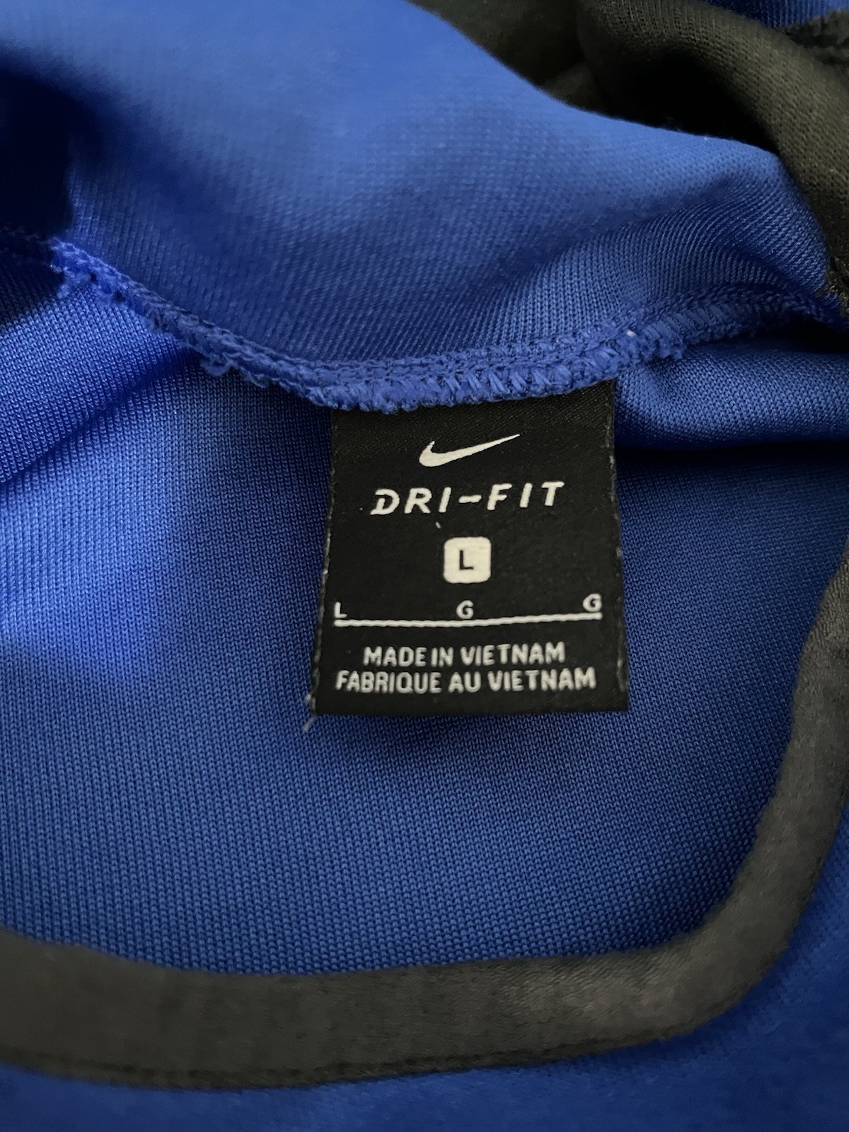The Nike Duke Blue Devils Basketball Dri-Fit Hoodie is a men's size large sweatshirt in blue and black colors. Officially licensed by Nike, this hoodie represents the Duke Blue Devils college basketball team. Made with high-quality materials and a capacity of 15 oz, this hoodie is perfect for fans who want to show their team spirit during the regular season. Whether you're hitting the court or just lounging around, this hoodie is a stylish and comfortable choice for any Duke Blue Devils supporter.