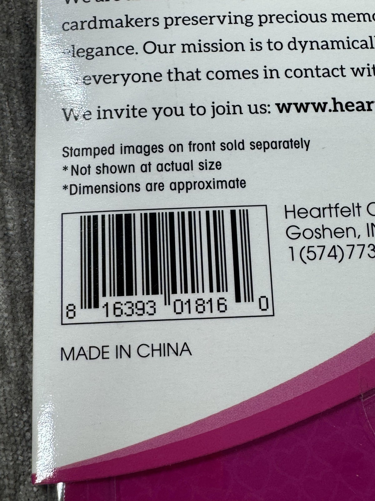 Packaging notes: Instructions included; stamped images on front are sold separately; images not shown at actual size; dimensions are approximate