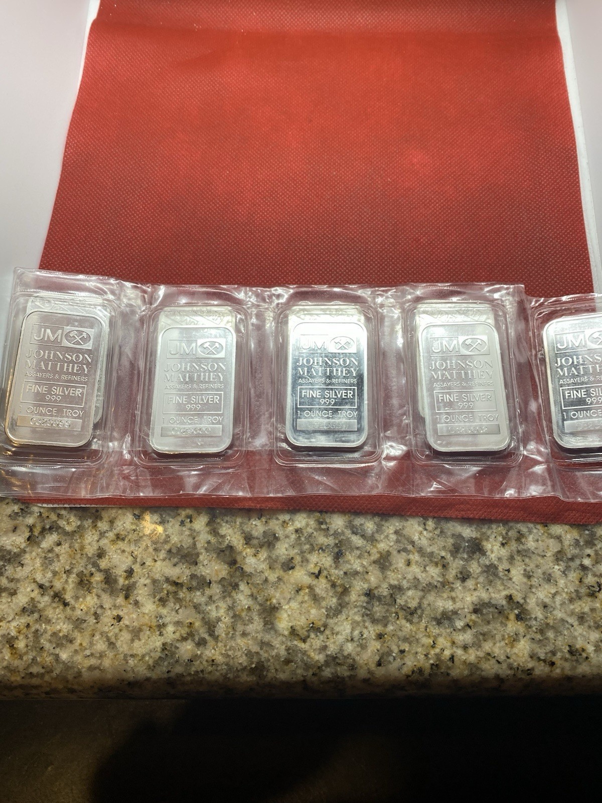 Five Johnson Matthey 1oz Silver Bars in Plastic