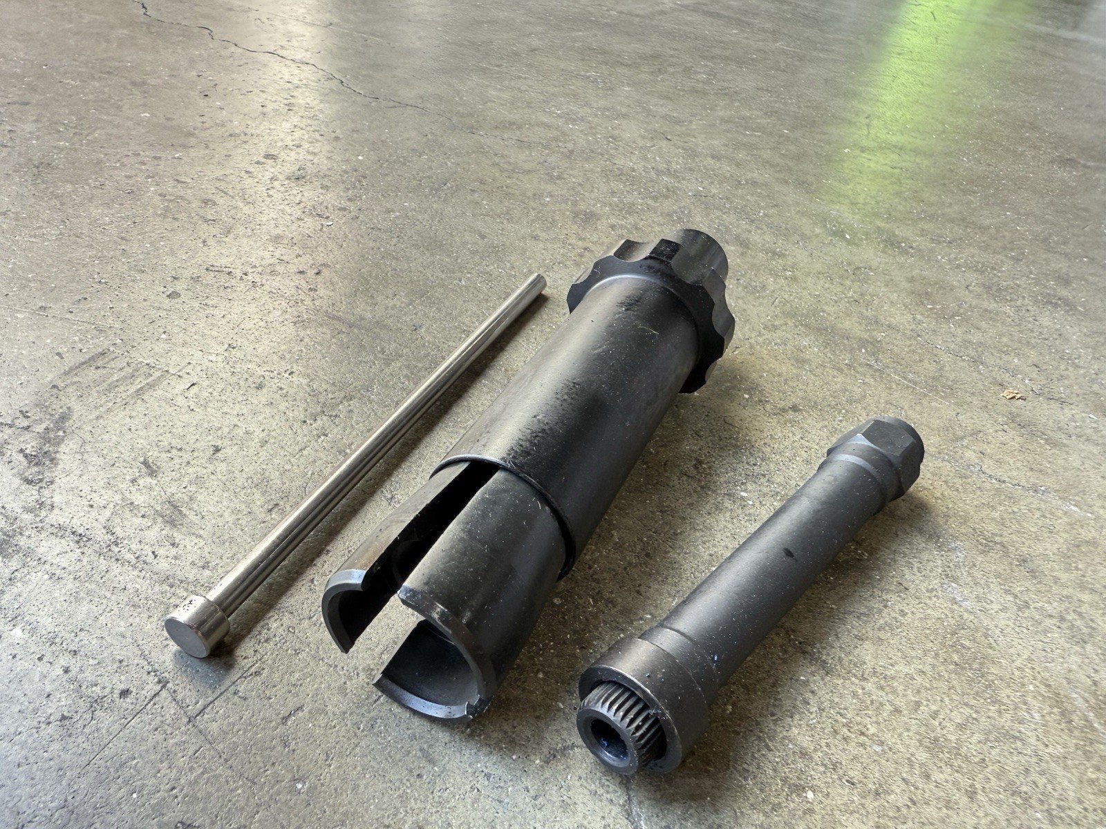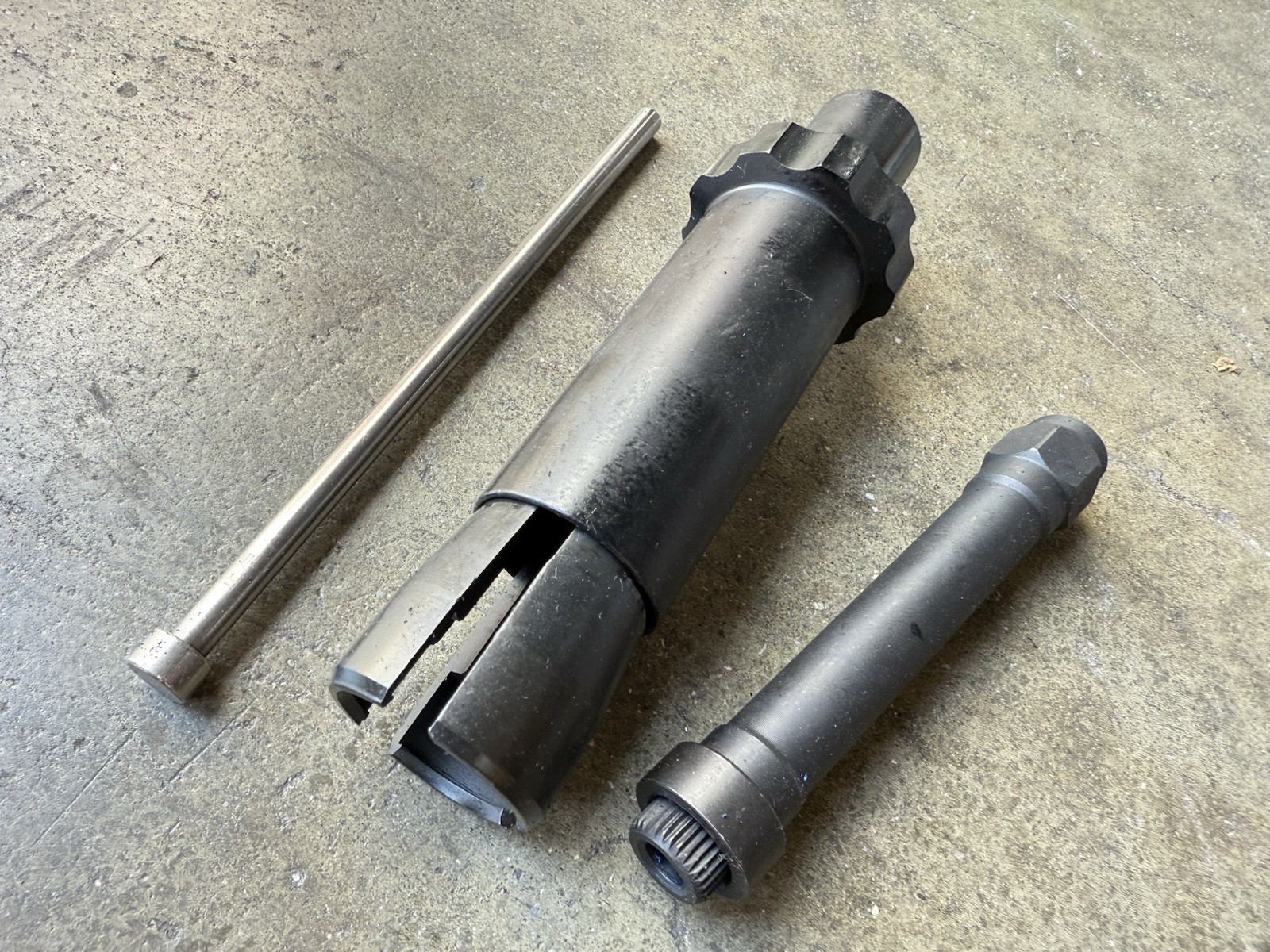 Remove the spinning collet from the wheel bolt. Then use the spline removal tool to remove the bolt from the rim.
