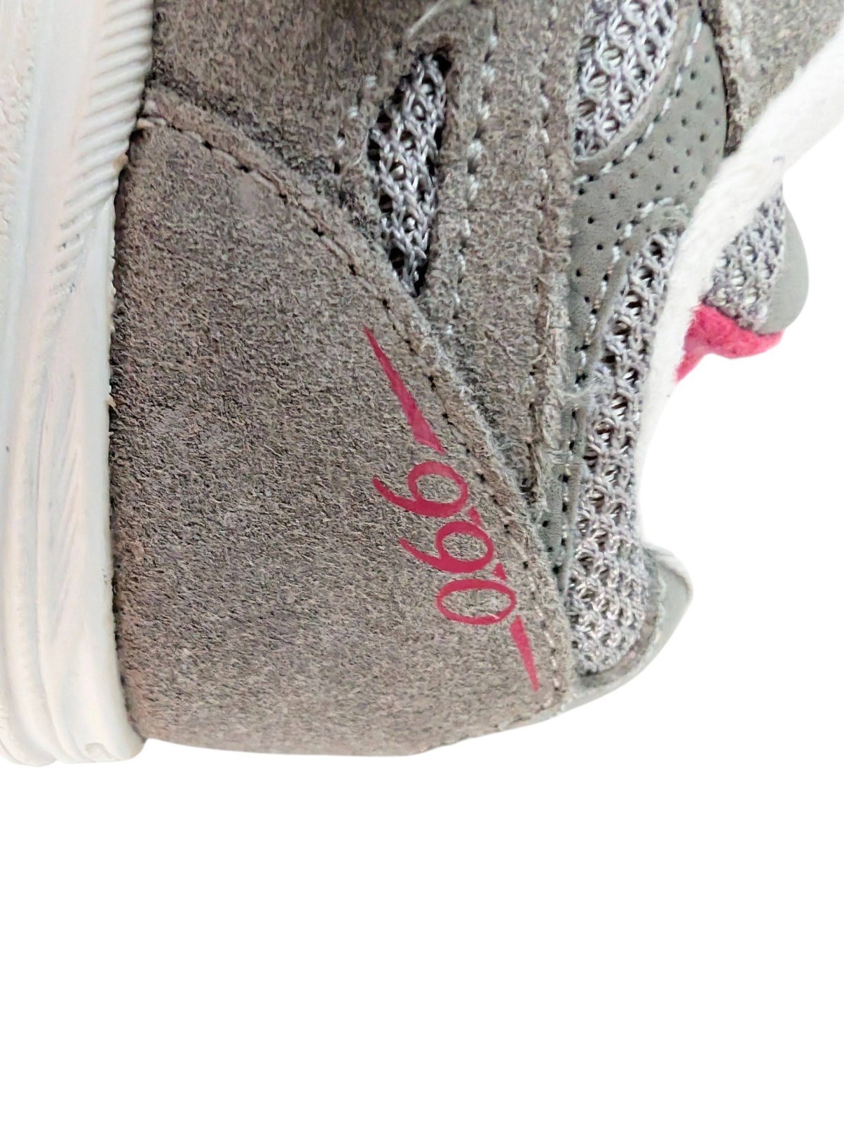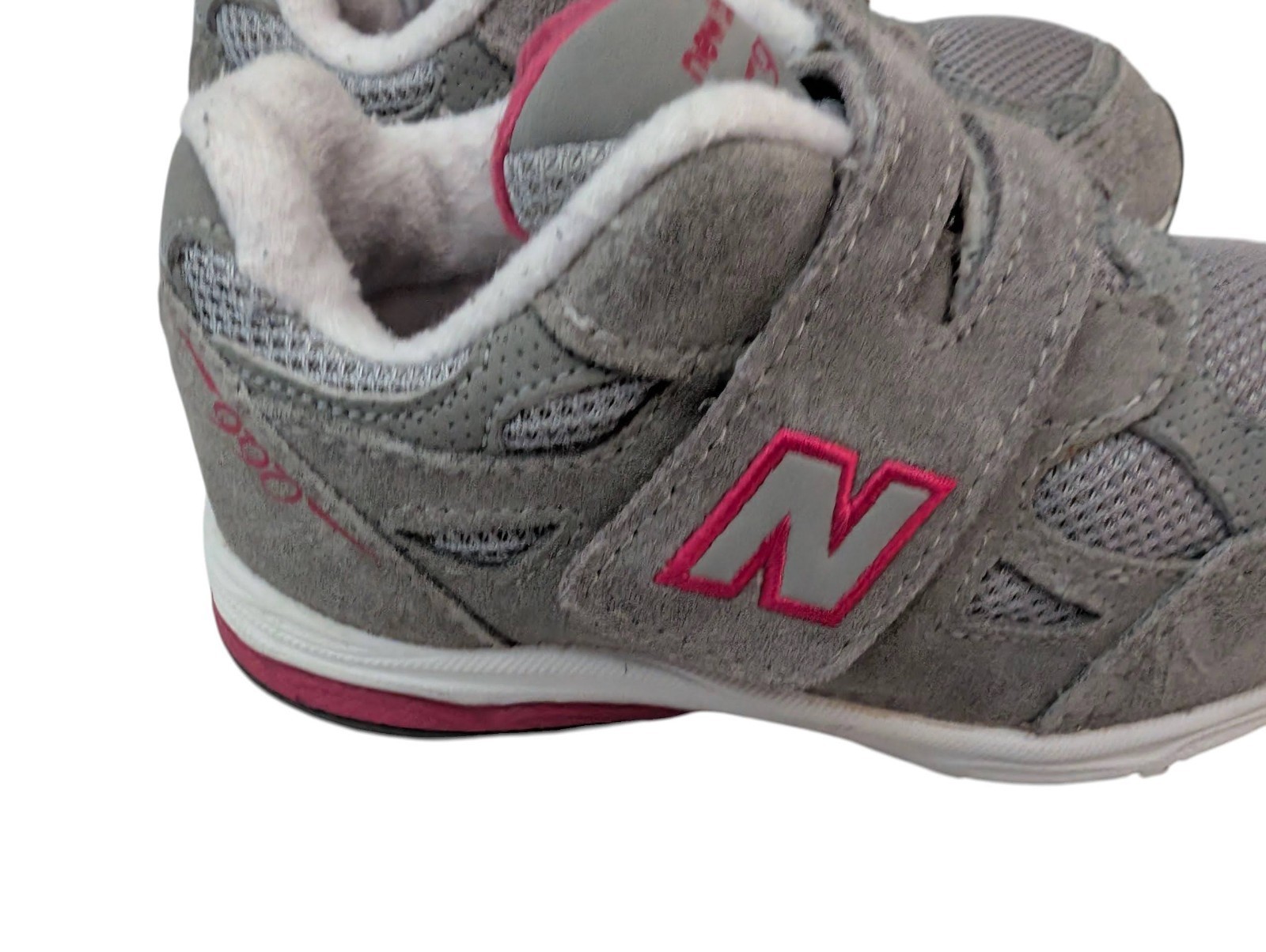 These are adorable to other girls in New balance 990 athletic shoes in size 9.5 toddler. Gray synthetic and suede upper with hot pink accents. These shoes look like brand new!