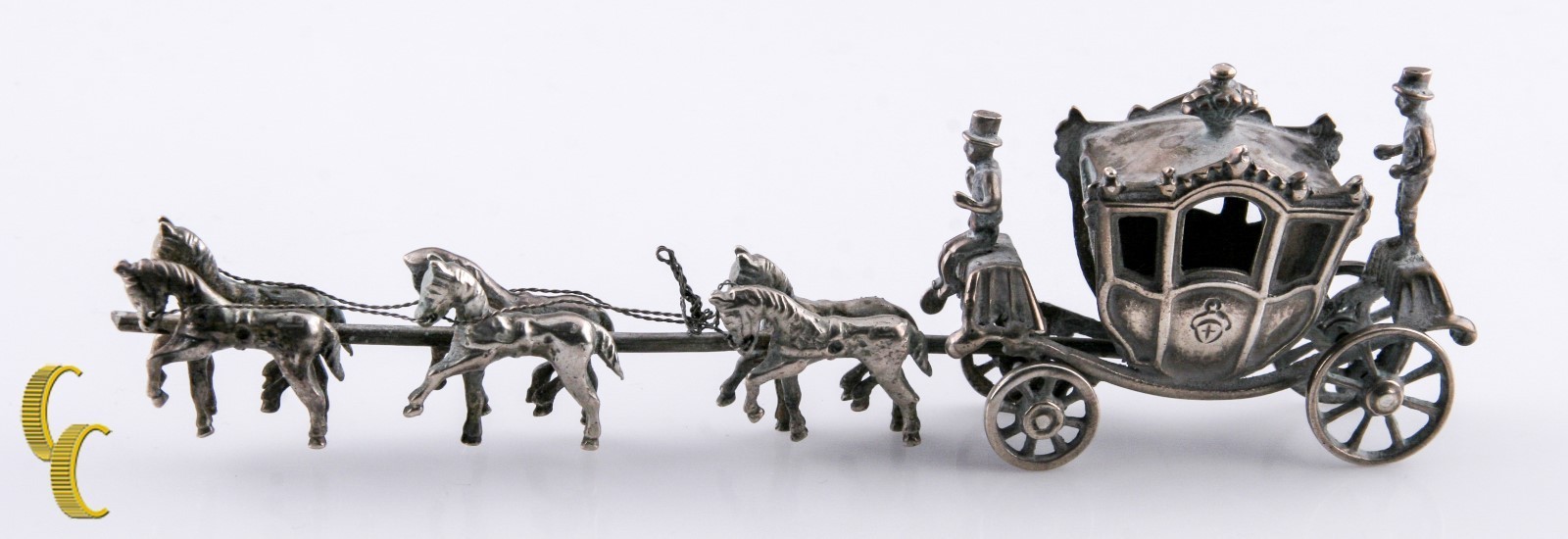 Uomini in miniatura con cavalli e carreggiata figurina da bambola vintage d'argento