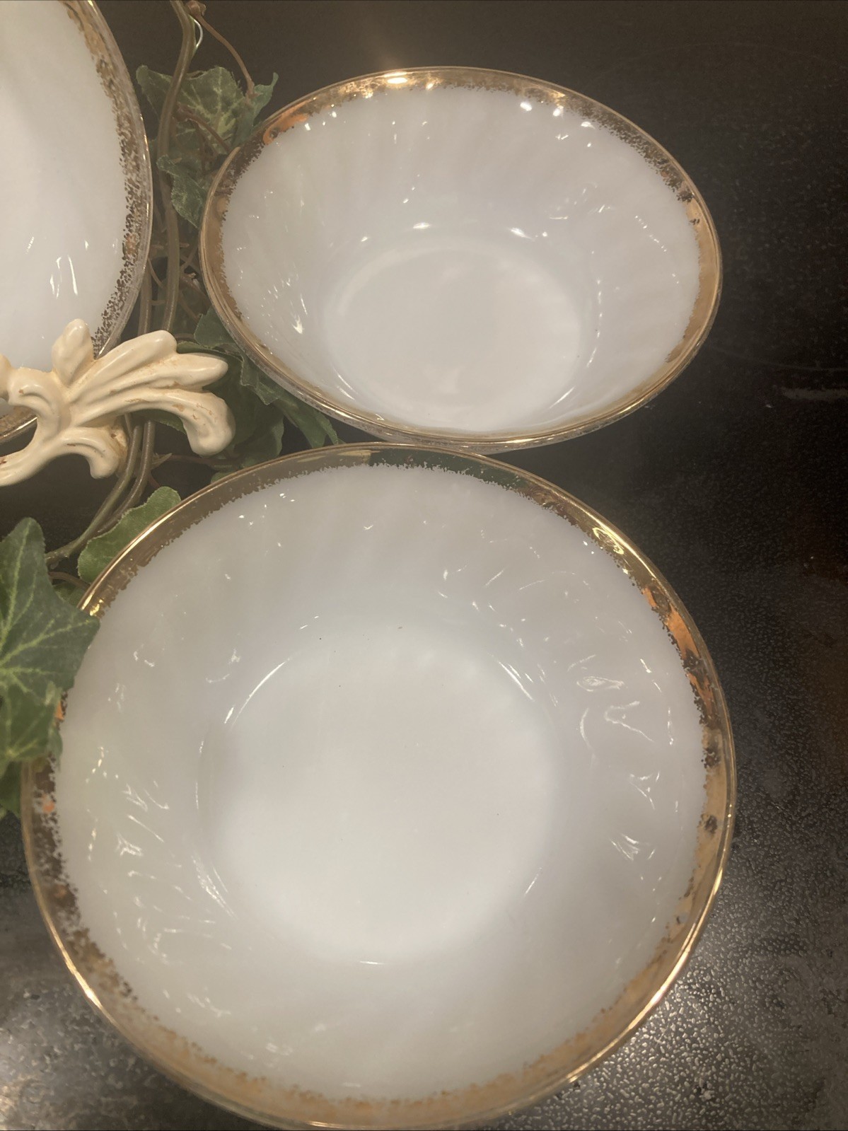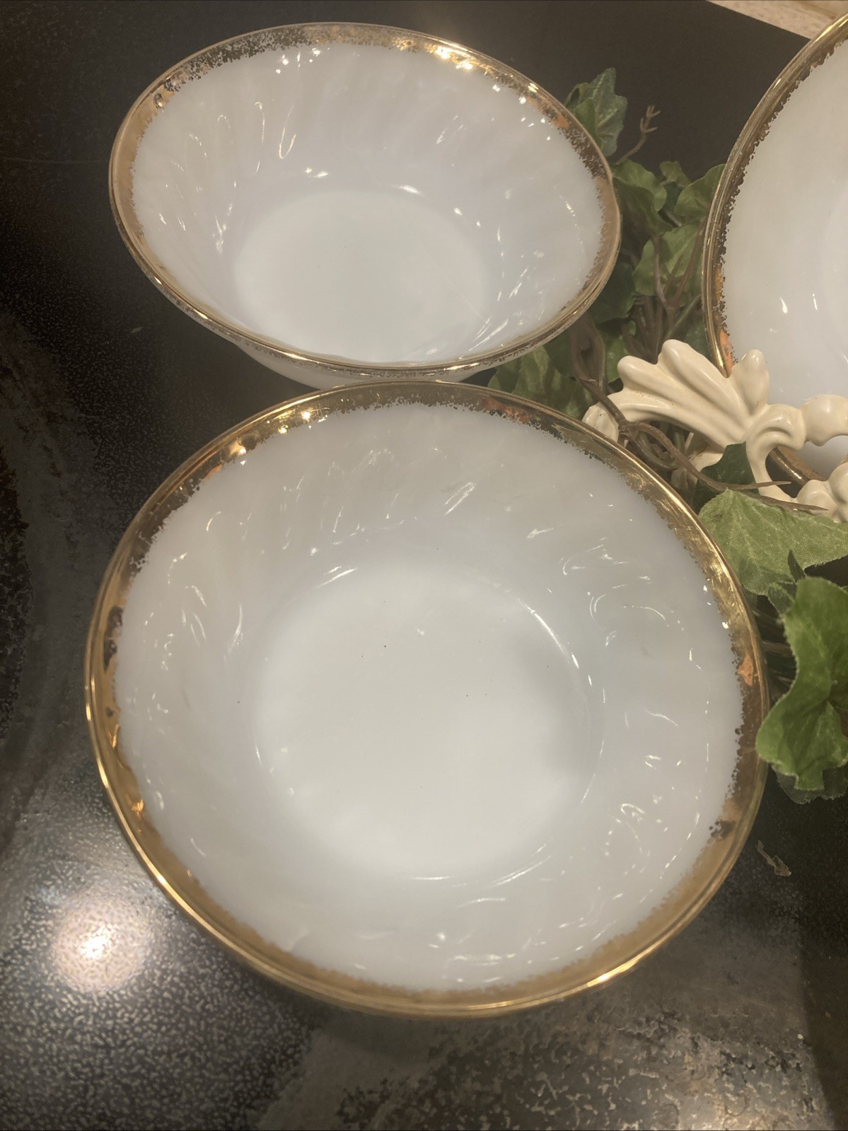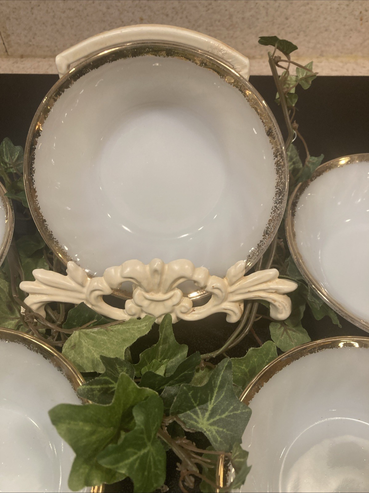 Vintage Set of Six (5) Fire King Oven Ware White w/ Gold Trim Dessert Bowls 5"