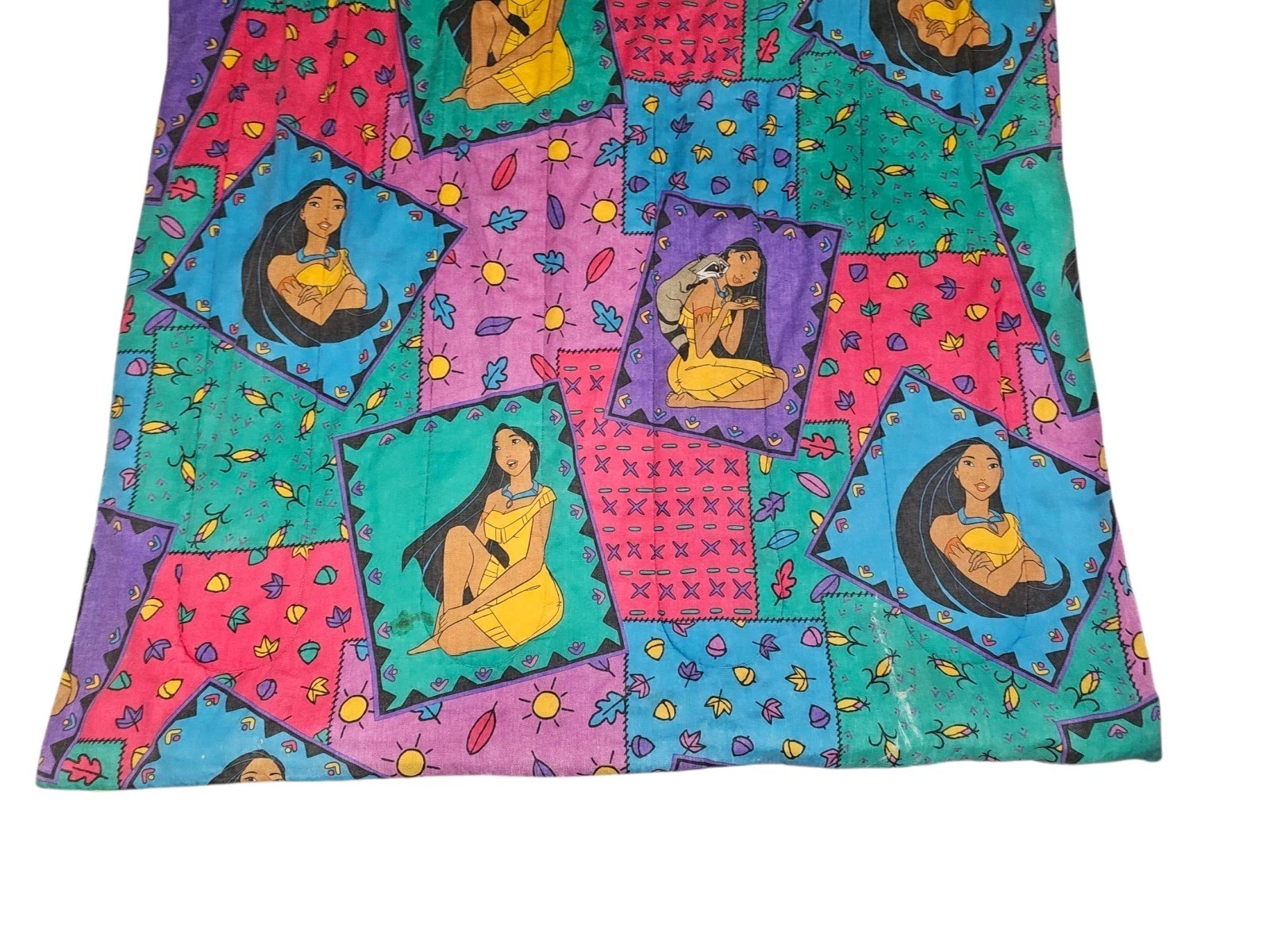 Has a little hole and fade on the bottom left side of the comforter. I have included a close up photo. This Vintage 90s Disney POCAHONTAS Reversible Comforter Blanket Bedspread measures 62x86 inches, making it perfect for any Disney fan's collection. Featuring the beloved character Pocahontas from the Disney franchise, this comforter is a nostalgic piece that pays homage to the 90s Disney World theme. With its unique design and high-quality construction, this comforter is a must-have for any Disney collector looking to add a touch of retro charm to their home.