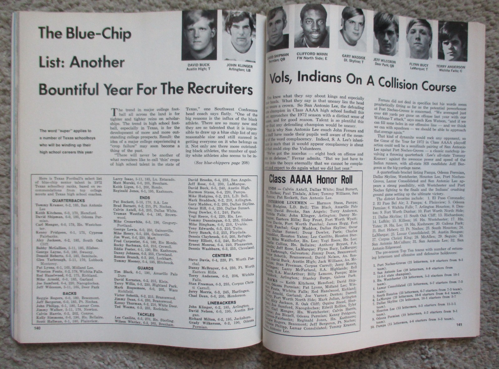 TEXAS FOOTBALL, published yearly is a magazine dealing with football prospects of all Class AAAA, AAA, AA, and A high schools in Texas, of the TCIL high schools and Southwest Prep League, of all four-year colleges and universities in Texas and of the University of Arkansas, of the junior college teams in Texas, and of the professional football teams in Texas.