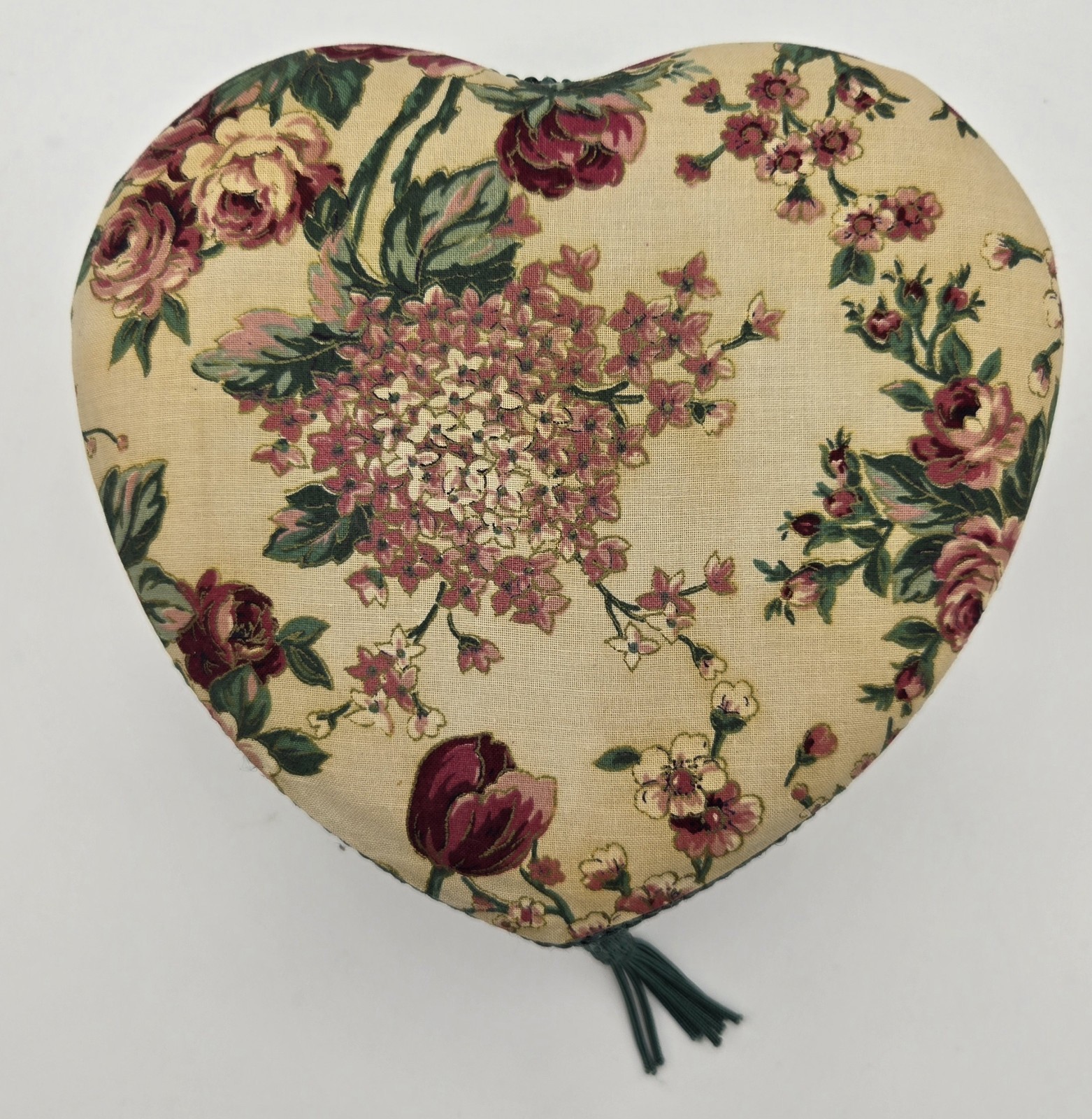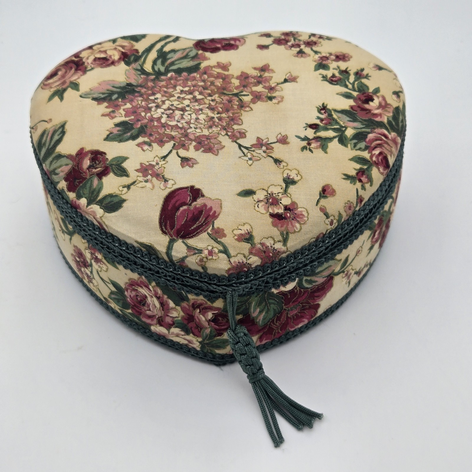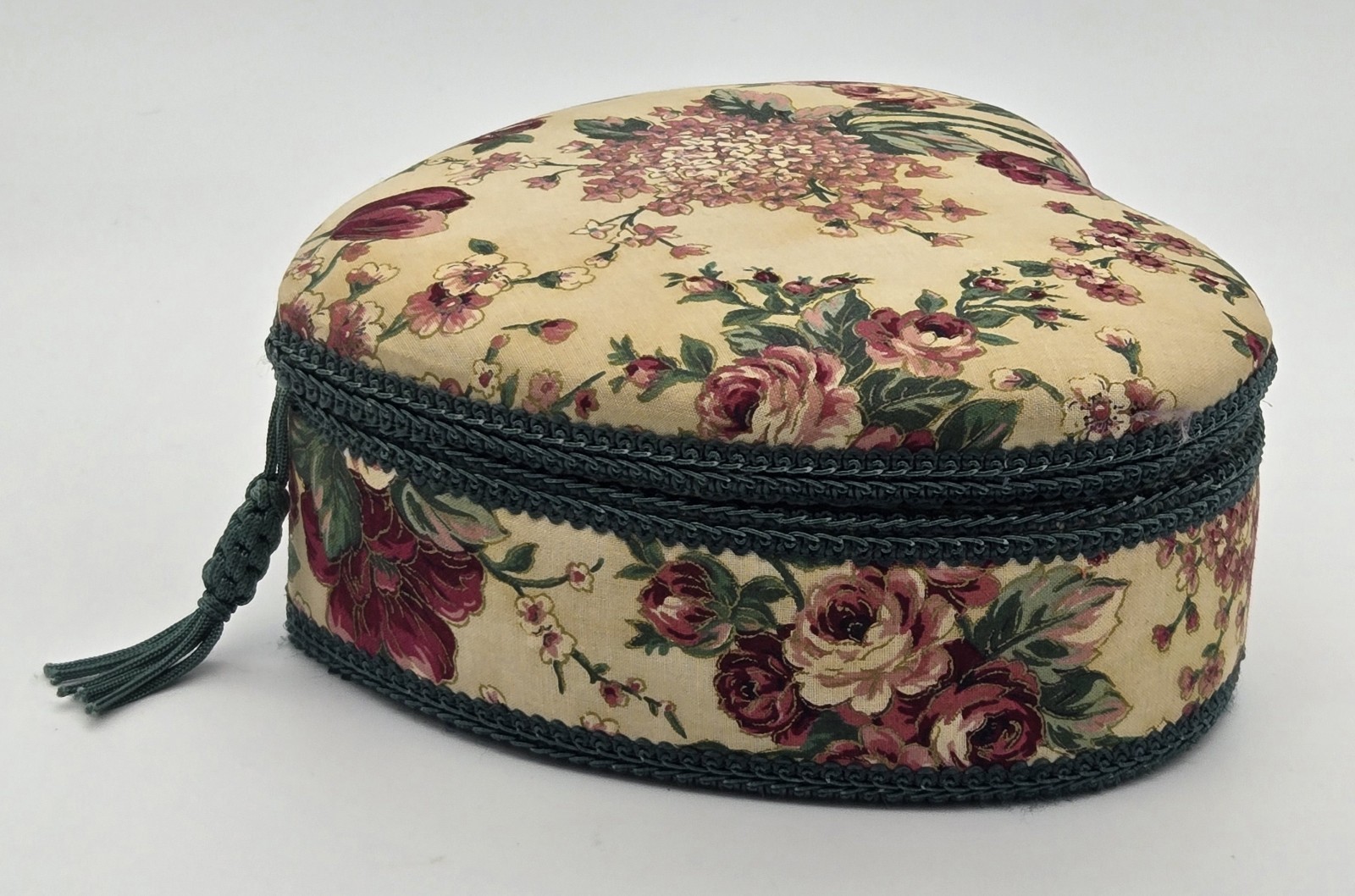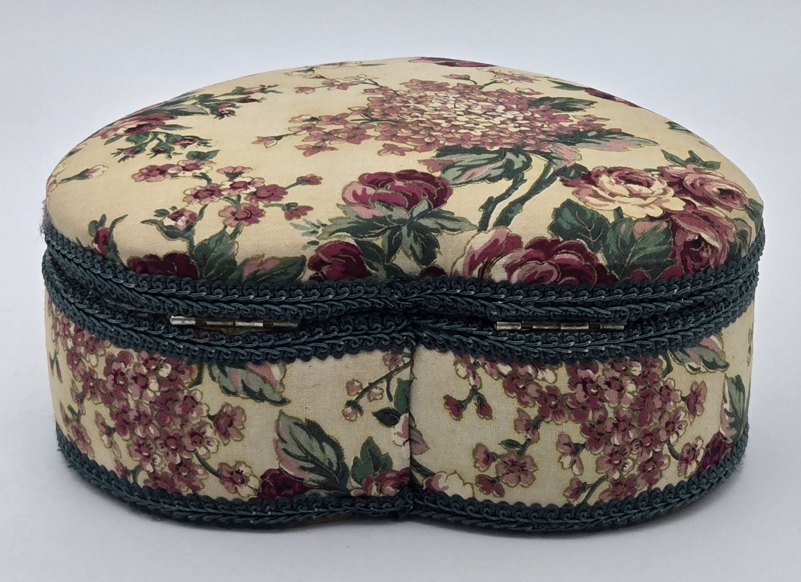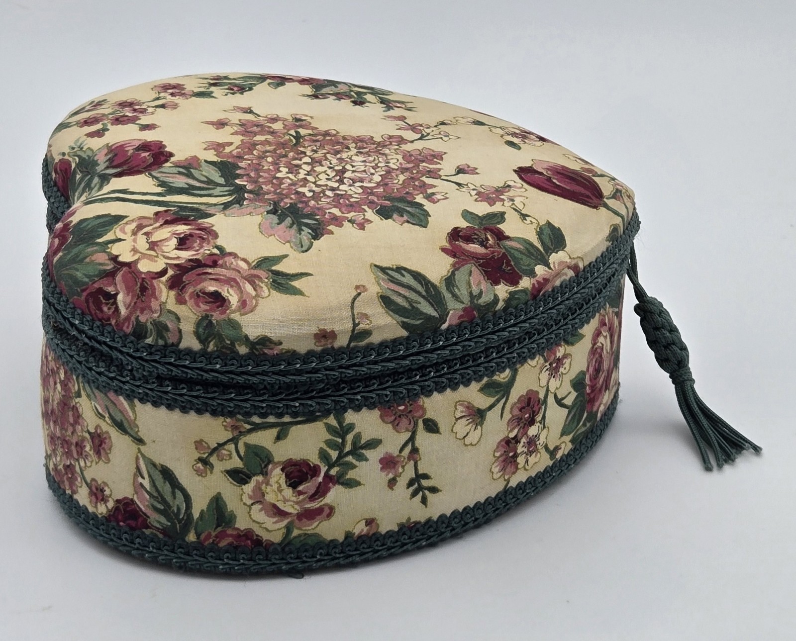 Vintage Heart Shaped Sewing Storage Box Basket Red Rose Green Floral Tapestry Cottagecore