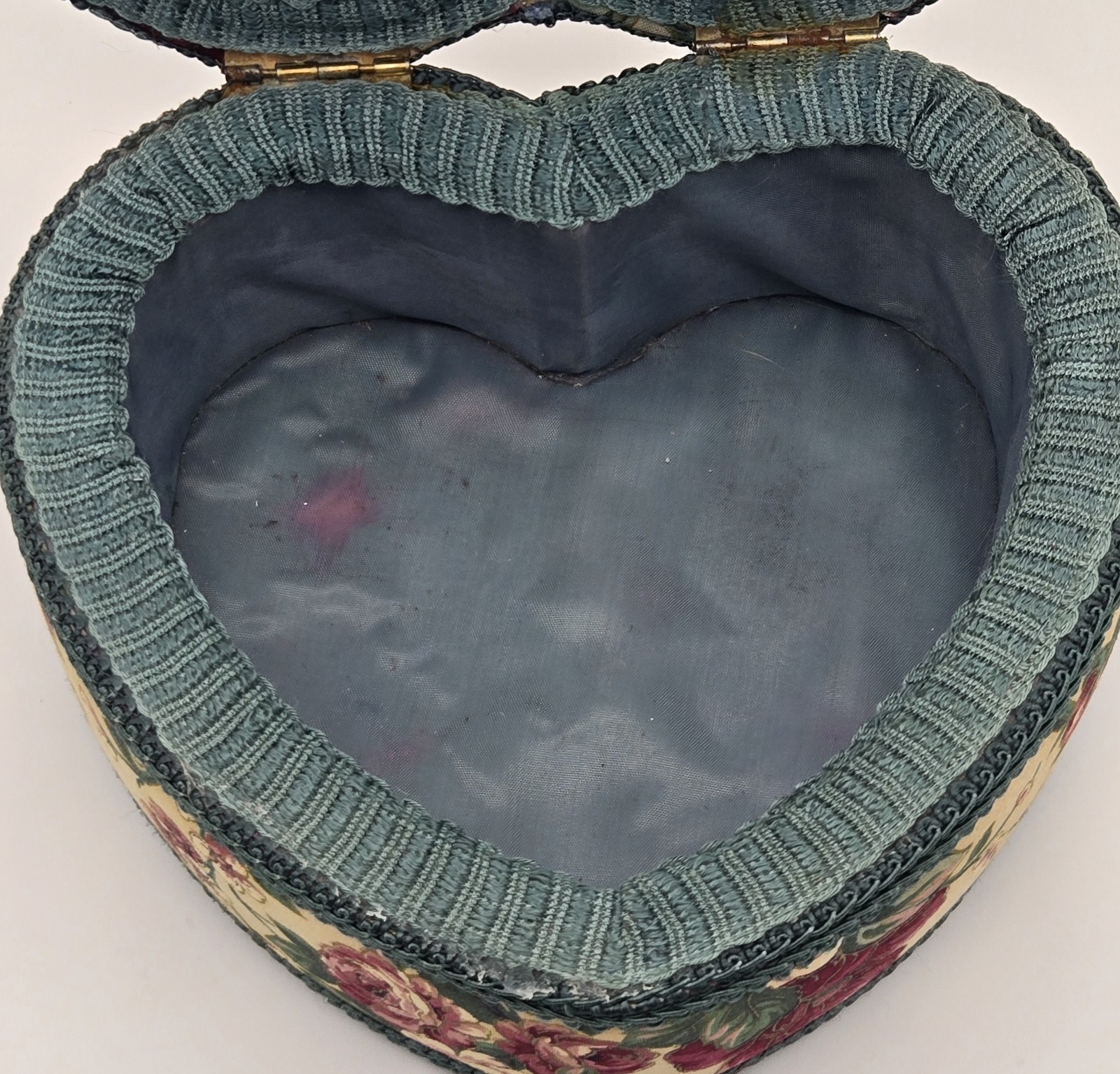Vtg Heart Shaped Sewing Storage Box Basket Floral Tapestry Cottagecore