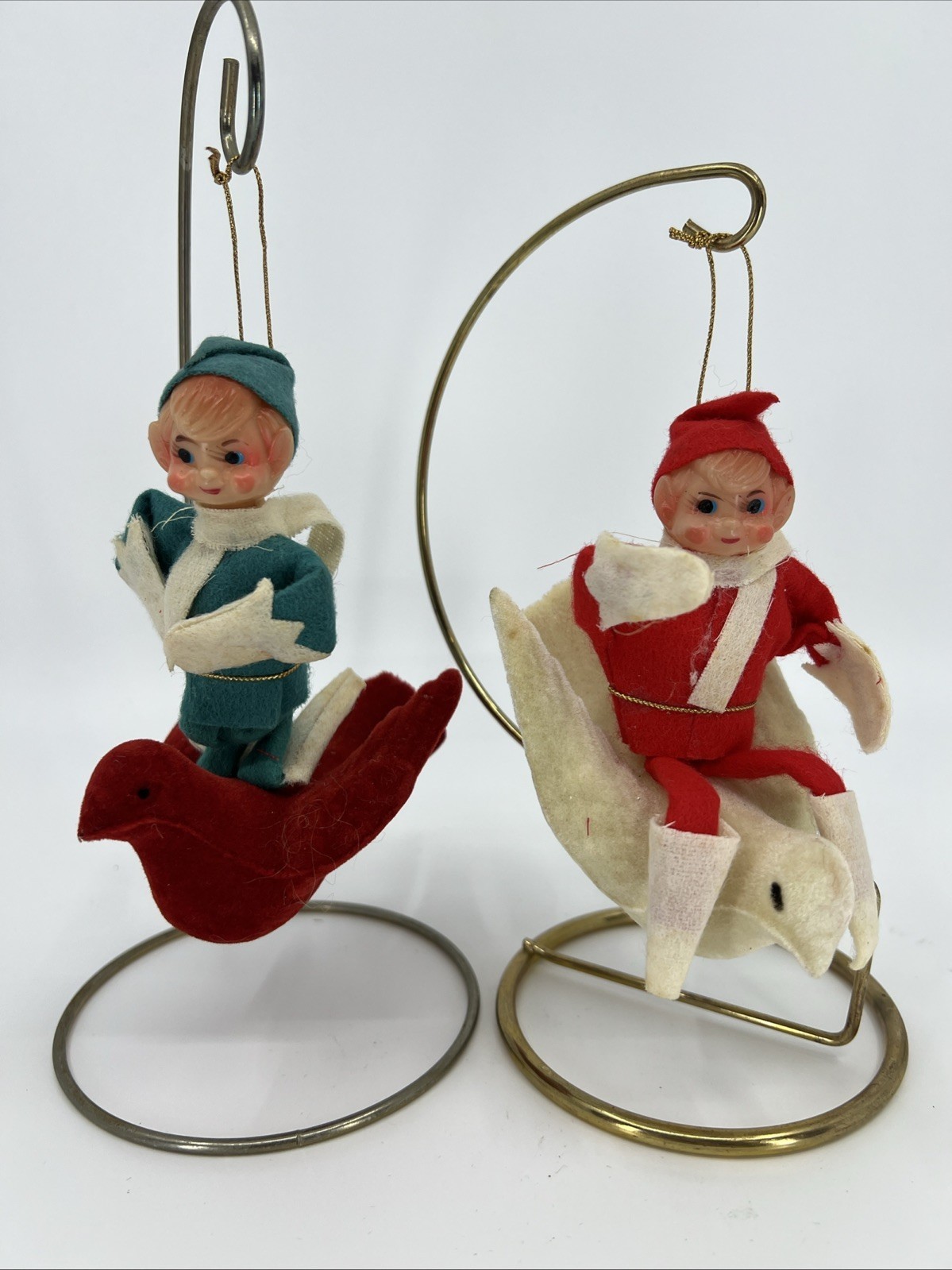 Great vintage condition. See pictures for details. From the top of each elf to the bottom of each dove is approximately 5 1/2 inches.