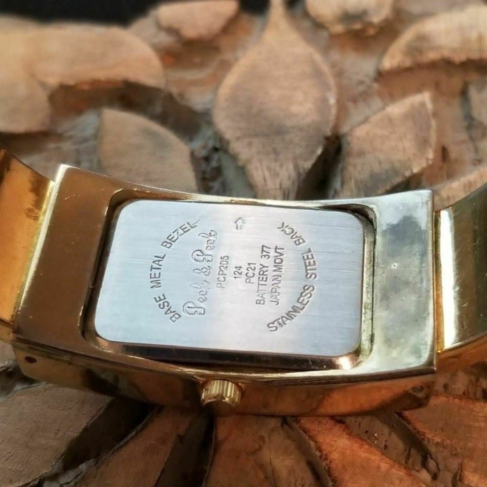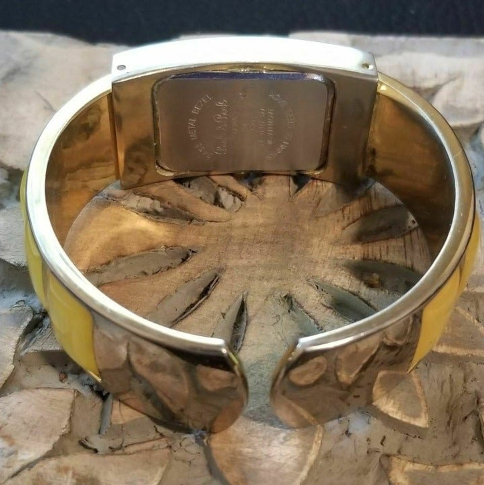 Stylish vintage Peck Peck clamper bangle watch featuring a sleek rectangular silver-tone bezel with a yellow enamel-style band. The watch face has a minimalist cream dial with gold-tone numerals and hands, offering a refined and modern look. Hinged clamper design allows for easy wear and removal. Marked on the back with model and maker details ? stainless steel back, Japan movement. In good preowned condition with light surface wear; untested for timekeeping. A great addition for collectors or everyday vintage wear.