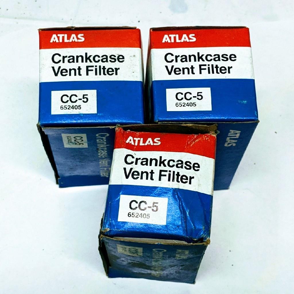 This listing features a set of six Atlas CC5 652405 Crankcase Breather Vent Filters, designed to be a direct replacement for various part numbers including FB106, AF26, 88976, 652412, BA6591, and FB106B. These vintage parts were manufactured in the United States and have a smooth finish.