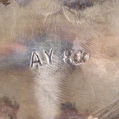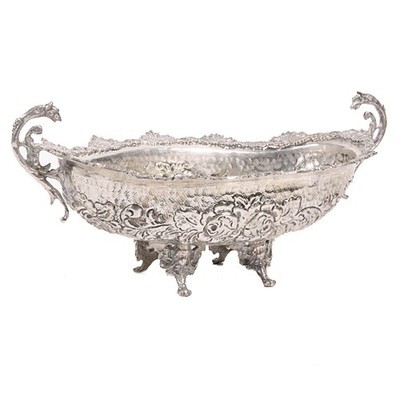 ANTIQUE 800 SILVER FOOTED DISH WITH HANDLES Antique Silver Centerpiece Footed Bowl Jardiniere Dish with Foliage Handles Repousse Roses throughout. Has Figural Maiden Head Hair at Feet. Rare Cast Feet Stamped "A.Y. 800" Gross Weight: 382.6gr Measures: 5 in. H x 11 1/8 in. L x 6 5/8 in. W