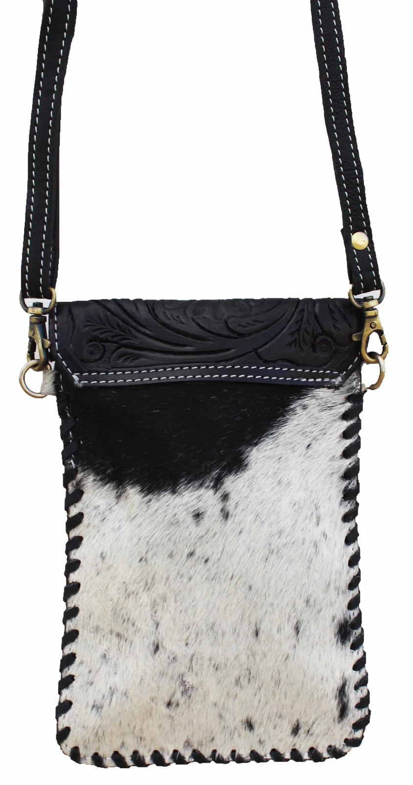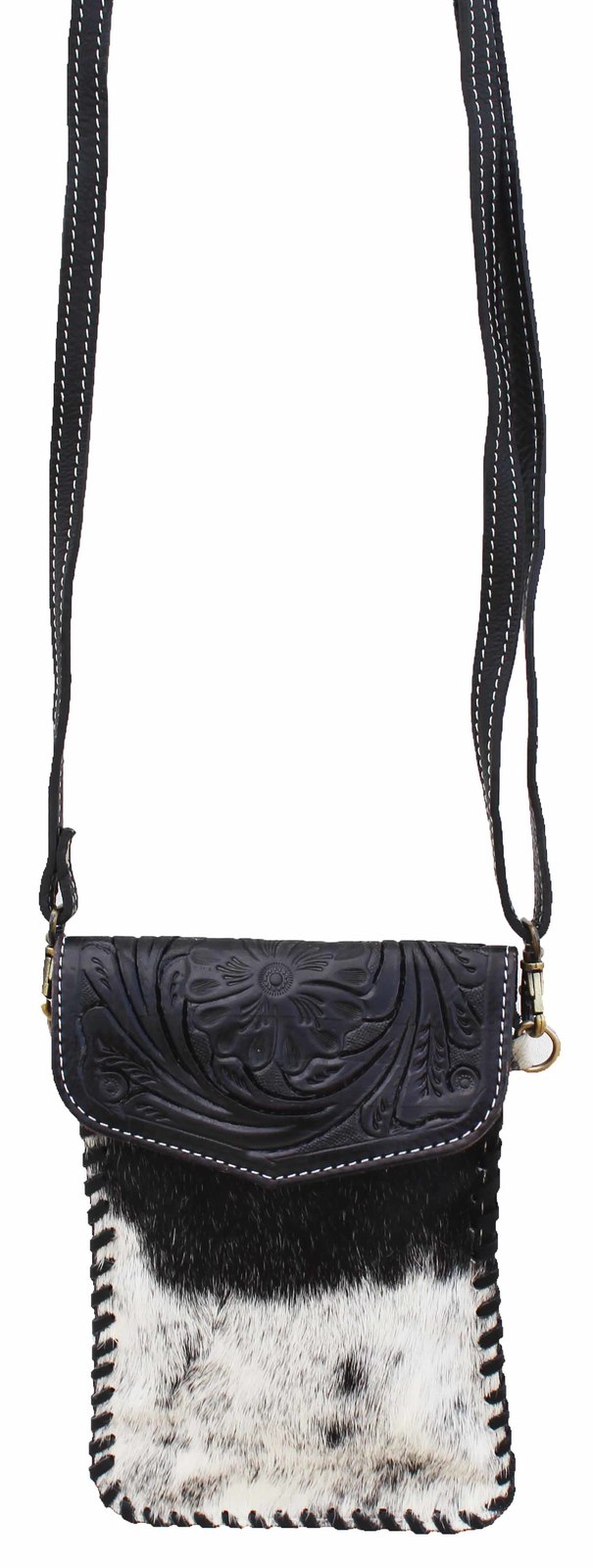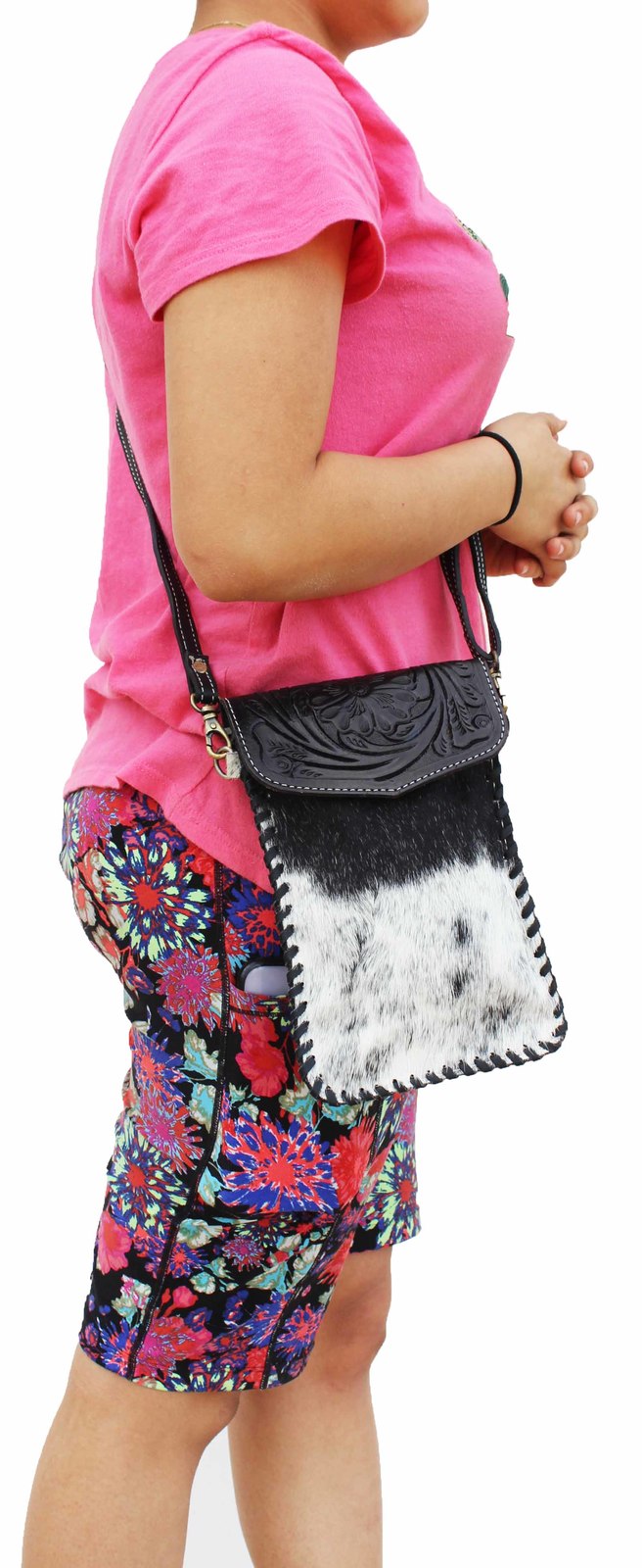 Challenger women's cowhide crossbody bag features a button closure and antique brass hardware. Beautifully accented with a floral tooled closure and leather laced edges. Versatile bag provides room for daily essentials such as phone, keys, credit cards. The fully lined interior features a side open compartment for a additional storage. Cowhide is a natural product, each bag may vary slightly in shading, or color making each item a unique product.? Bag measures 6-1/4" long x 9" tall.
