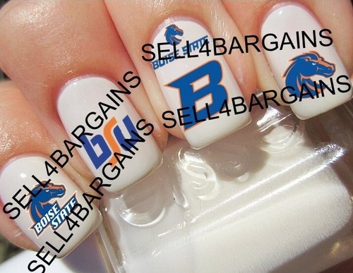 This is a listing for 20 handmade salon quality nail design clear transfer graphic art decals of the BOISE STATE BRONCOS COLLEGIATE Designs as pictured.