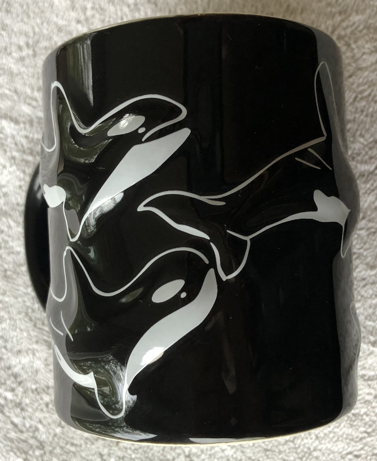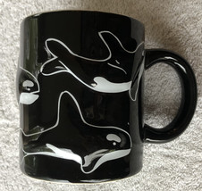 Cool black ceramic mug with killer whales on all sides in relief. Mug shows no signs of use and has bright finish. 3 5/8" height.