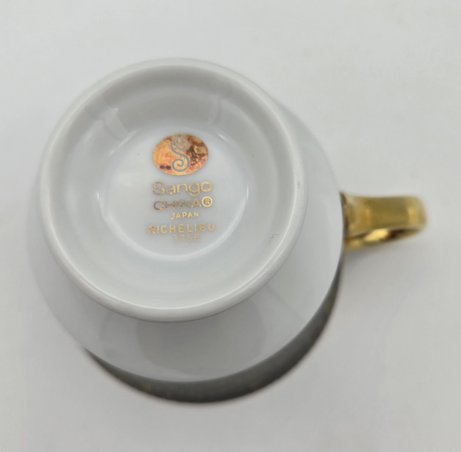 Enhance your vintage china collection with this elegant Sango China Japan Richelieu 3756 set featuring a cup, saucer, and dessert plate. Each piece is crafted from fine porcelain with a sophisticated black background accented by intricate gold detailing, showcasing mid-century design excellence. Marked with the official Sango Japan backstamp, this set combines collectible value and functional beauty. Ideal for formal tea or coffee service, special occasions, or display, this timeless black and gold set brings luxury and refinement to any table or cabinet.