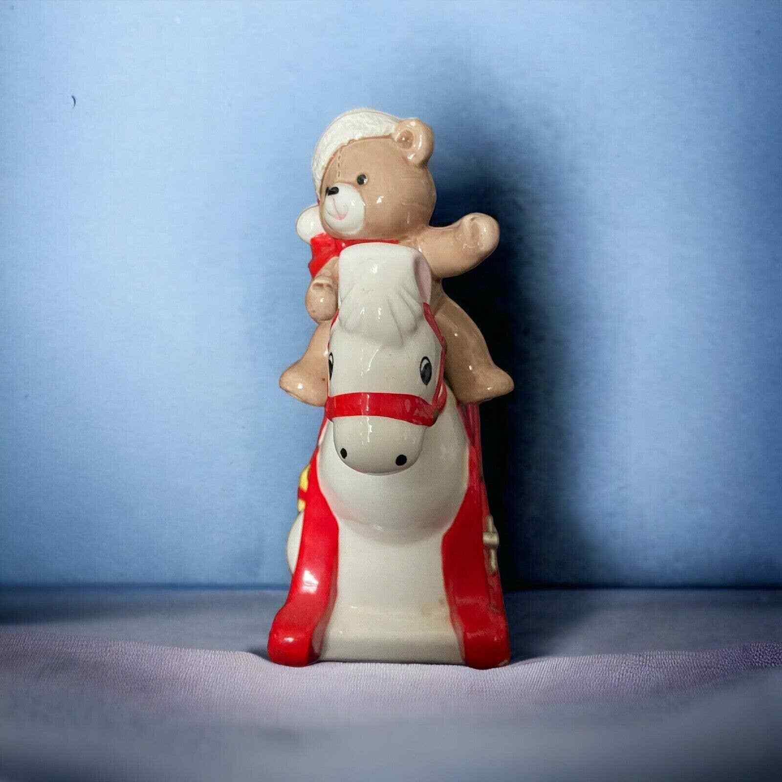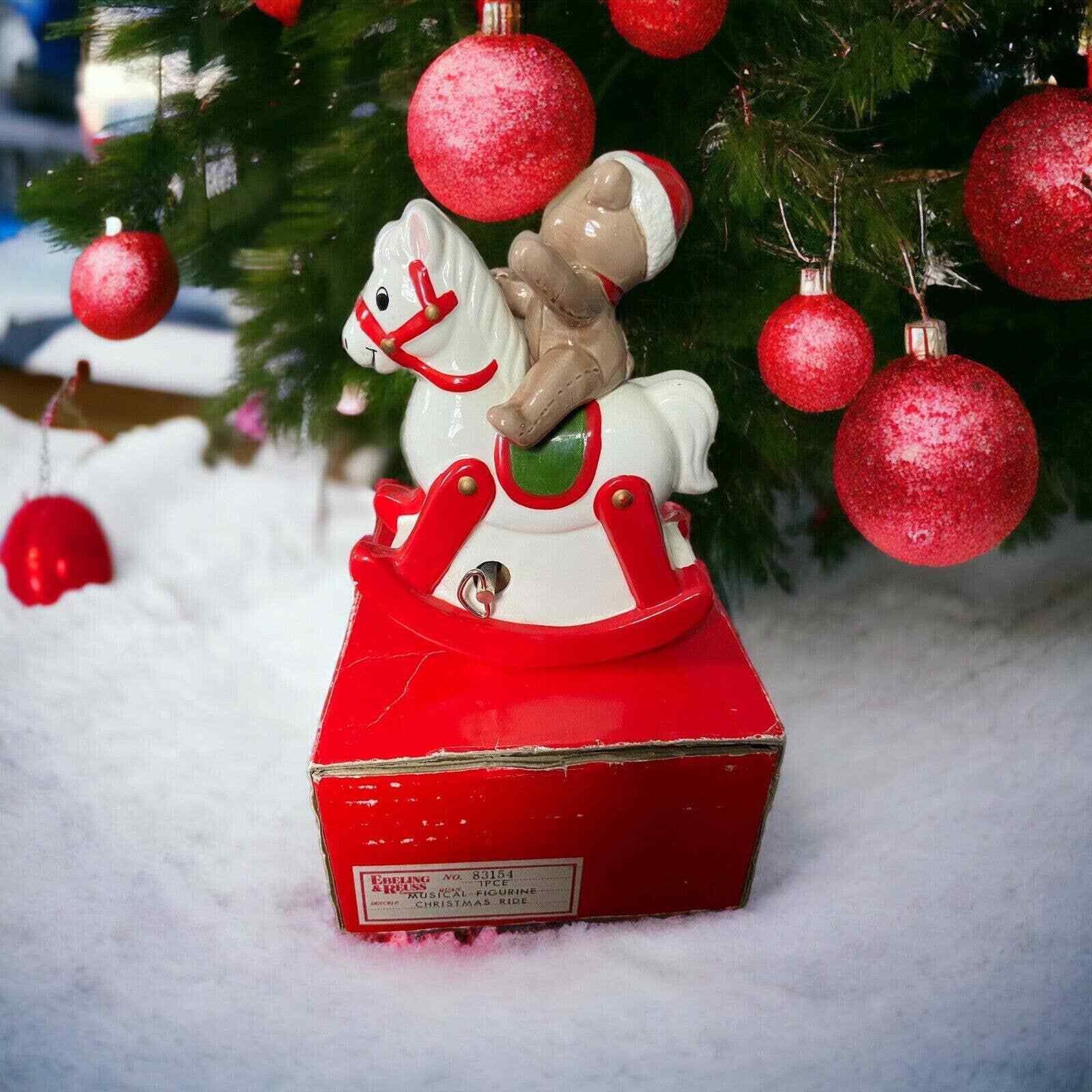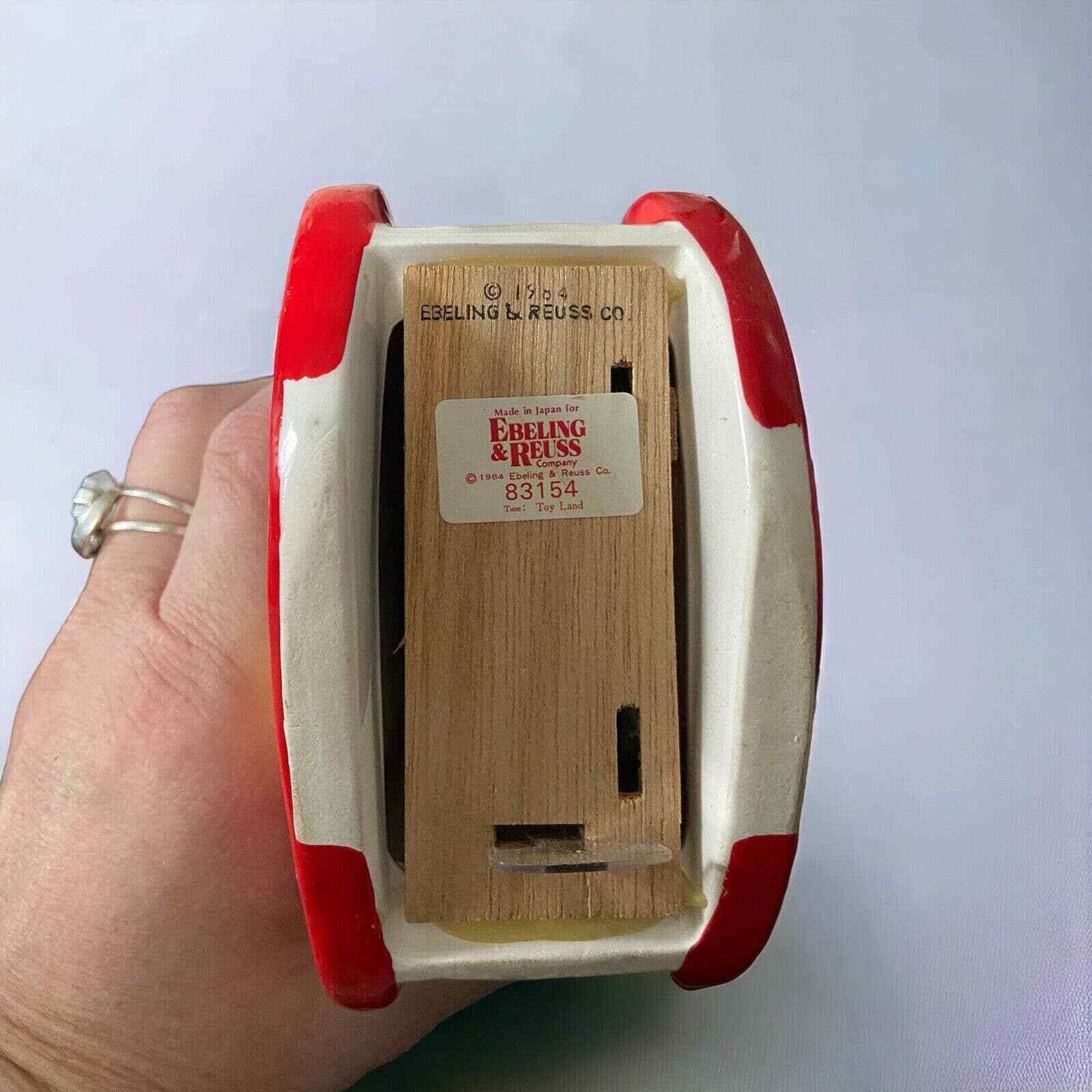 Introducing a vintage 1984 Ebeling Reuss teddy bear music box, titled "Christmas Ride". This adorable collectible features a glossy ceramic and porcelain finish in assorted colors, standing at a height of 6 inches with a width of 5 inches. The music box plays the tune "Toy Land" and is perfect for Christmas occasions or as a charming addition to your figurine collection.