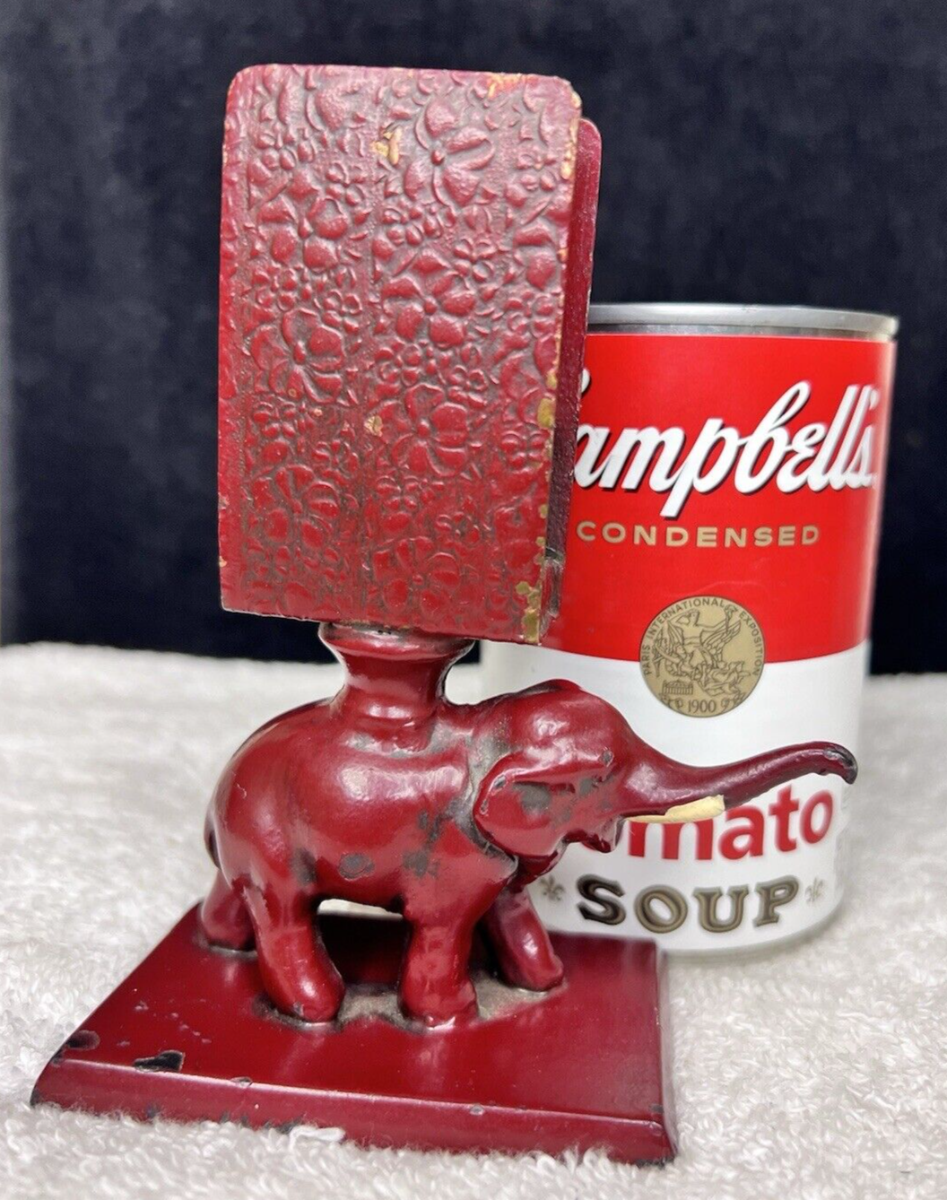 Old Cast Metal Elephant Trunk Up Matchbox Holder Red Detailed 4 3/4 Inch Tall