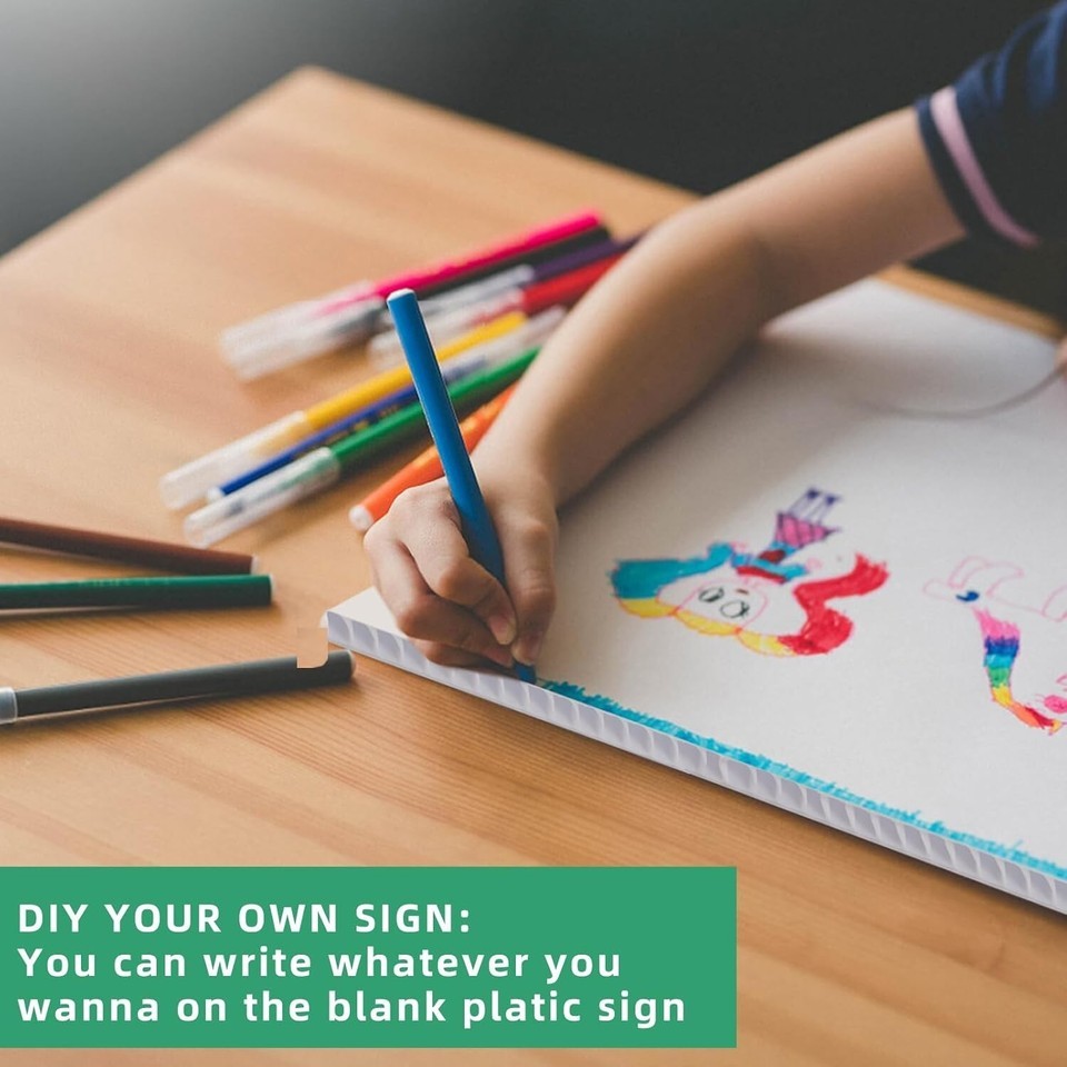 ?Multiple Use?White plastic board sign can use as a versatile tools, such as reminder and warning, it will definitely catch the attention and providing directional guidance, suitable for road, lawns, garage, advertising, rent, Open House, parties, Estate Sale, businesses, parties, weddings, decorations, graduations, political events or DIY and More!