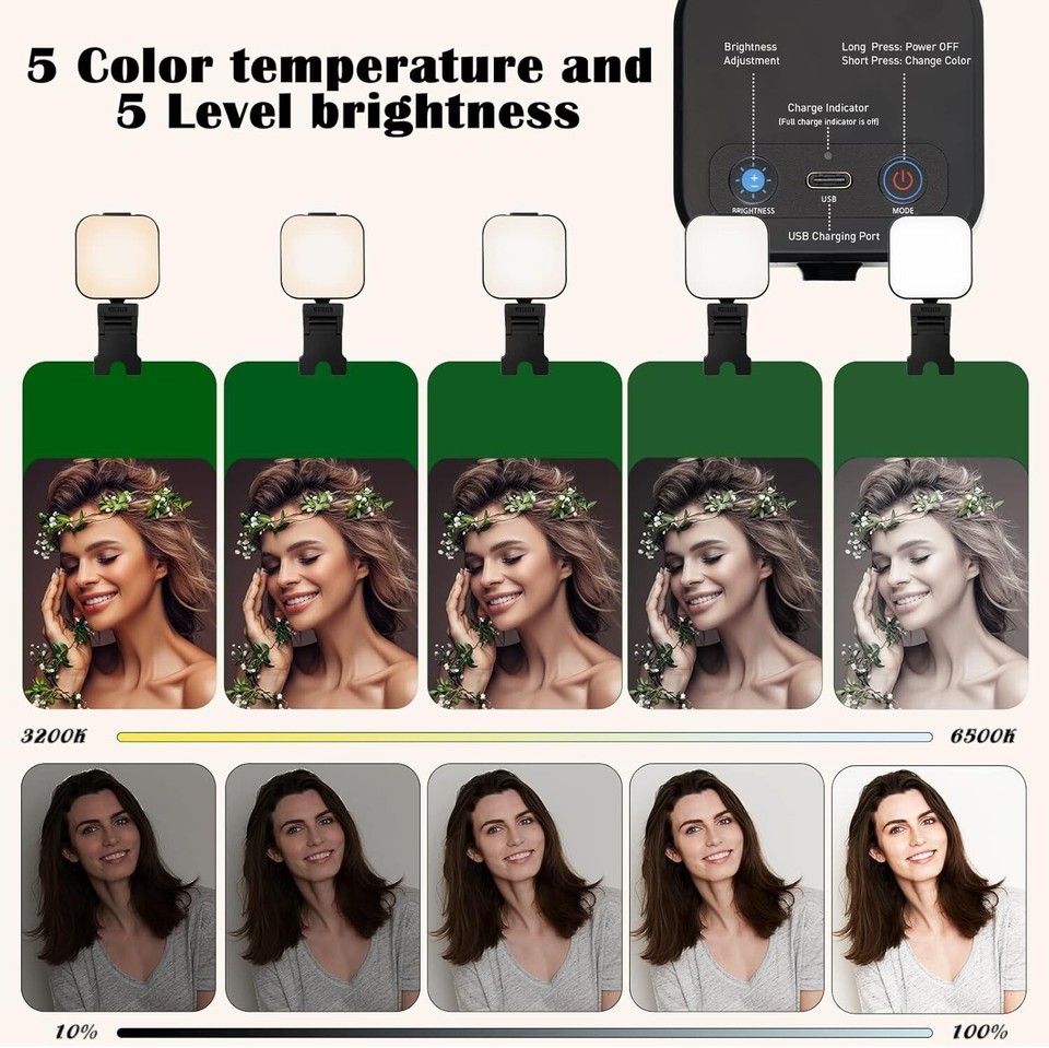 ?5 Light Modes 5 Brightness Levels?: The phone light has 5 Light Modes ( warm, warm white, natural white, daylight, cool white)which provided to meet your various usage needs, allowing you to be charming in any situation, such as makeup lighting, selfies, video recording, video conference, vlog show, live streaming. Built in 64 LED lighting beads to solve the problem of light, improve the quality of night photography.