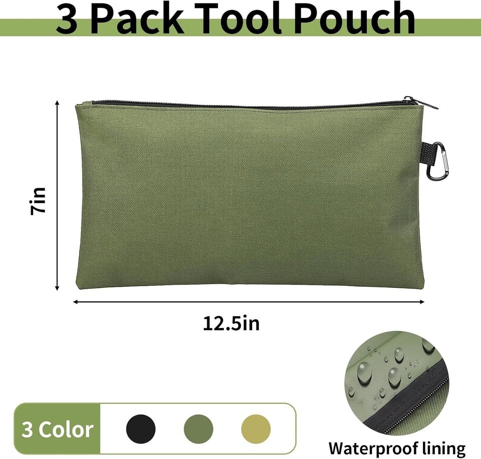 Large Capacity 3 Different Colors: The tool pouch bag measures 12.5 x 7 inches, with enough space to organize tools. Keep your tools safe and help you work efficiently. 3 different colors of small tool bags, to help you find what you need quickly