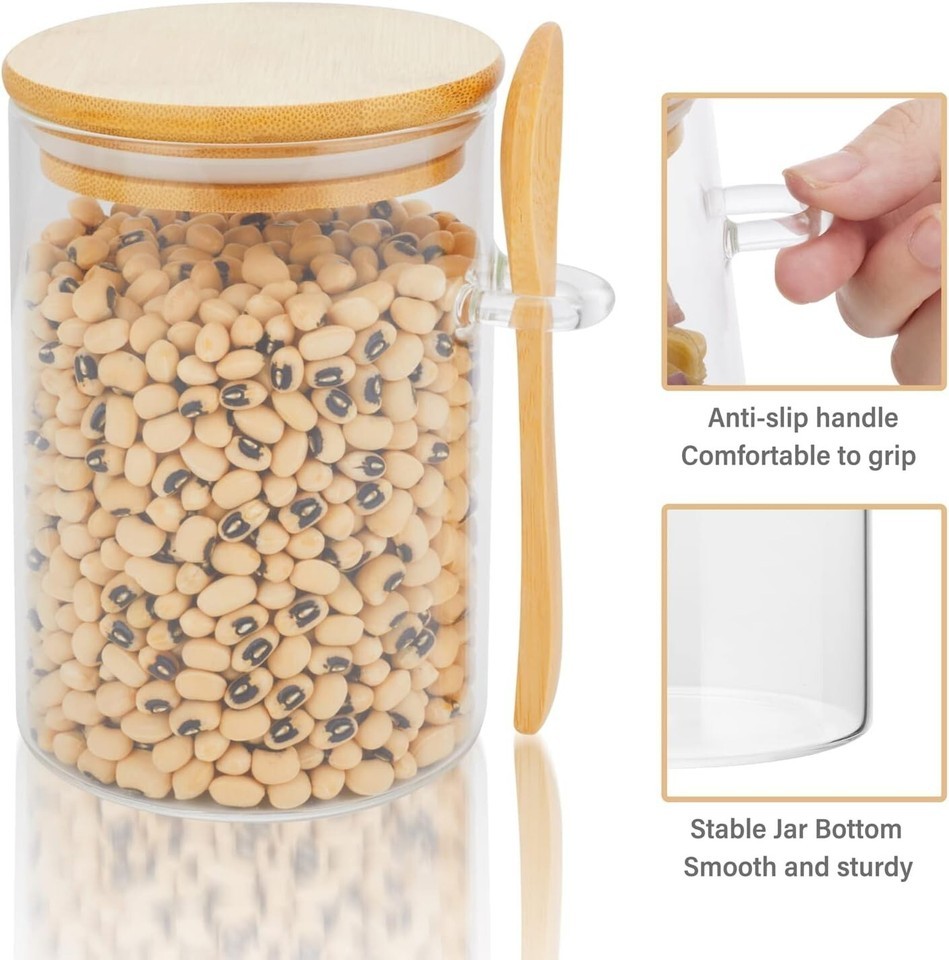 ? Practical Design: Each glass jar comes with an individual bamboo spoon attached to the front, making it easy to scoop up and serve your favorite ingredients. The wall of the glass also features a small loop handle for easy gripping during use and the ability to hold the spoon.