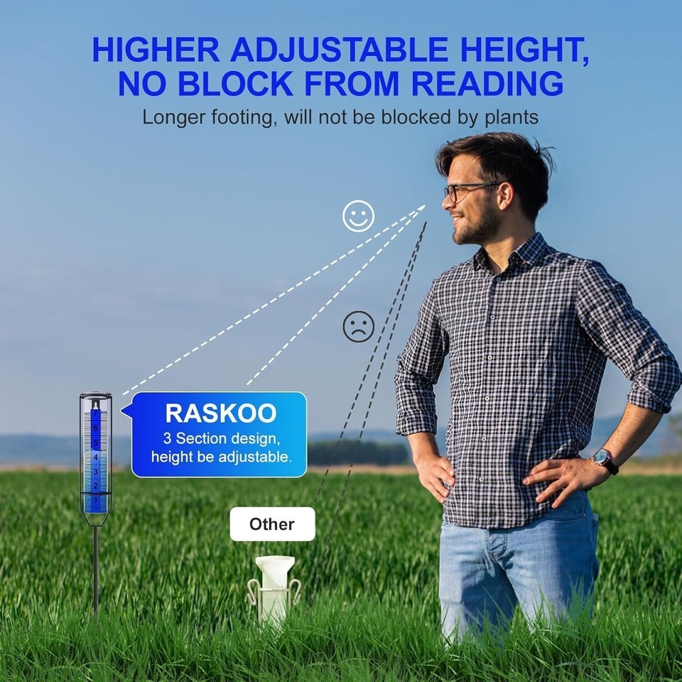 ?LONGER FOOTING, ADJUSTABLE HEIGHT?This rain gauges for yard is upgraded to 3 section design which can help you adjust the height according to your need, the longer footing make it not easy to be blocked by plants. This will be easier for you to read.