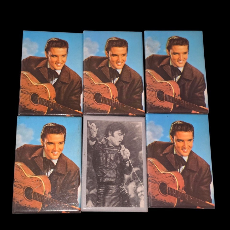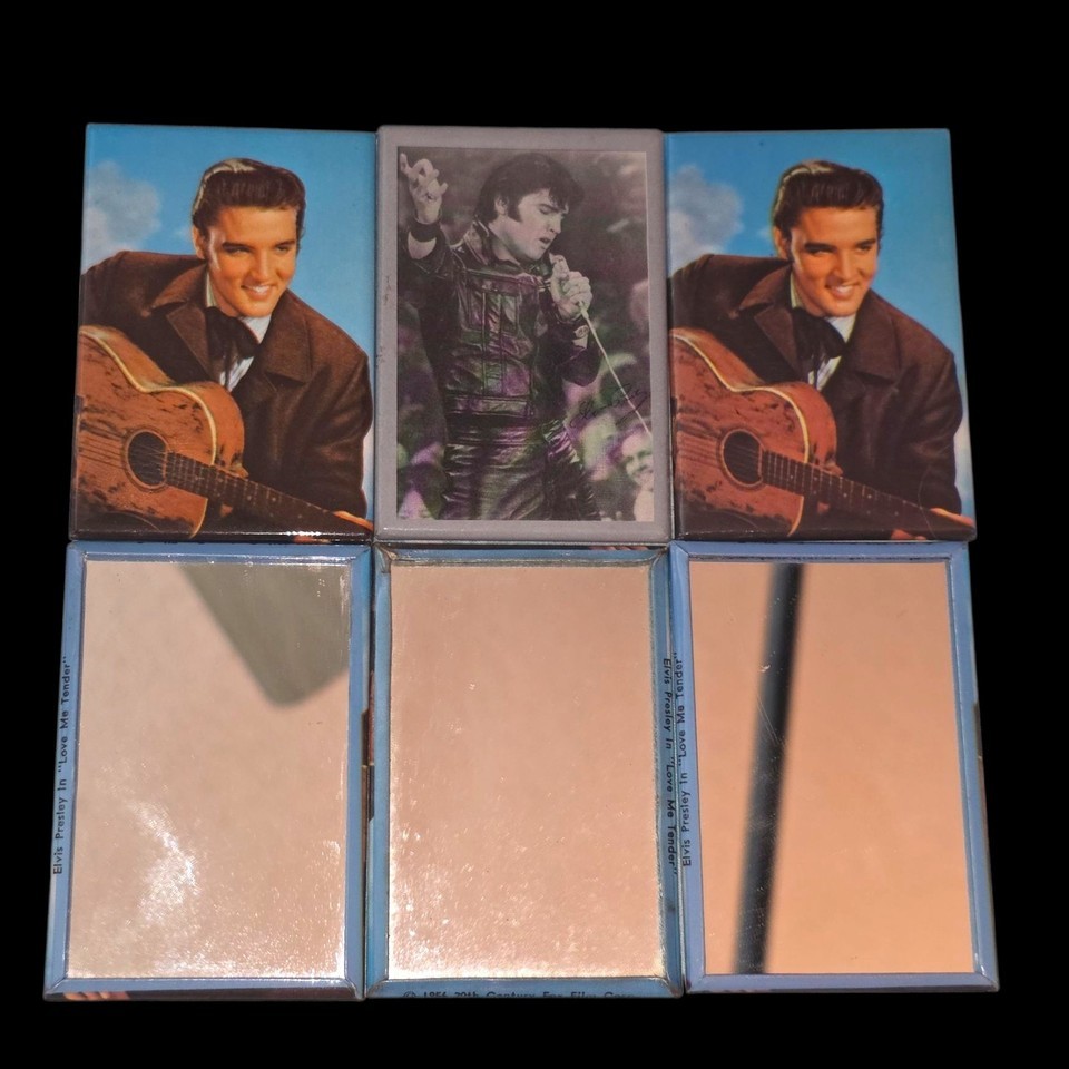The product is a lot of 6 vintage Elvis Presley pocket mirrors, each measuring 2"x3". These mirrors are made in the United States and are a collectible item for fans of Elvis Presley. They serve as a unique and nostalgic piece of memorabilia, showcasing images of the legendary artist. Perfect for collectors or fans looking to add a touch of vintage charm to their space, these pocket mirrors are a special and distinct advertising piece.