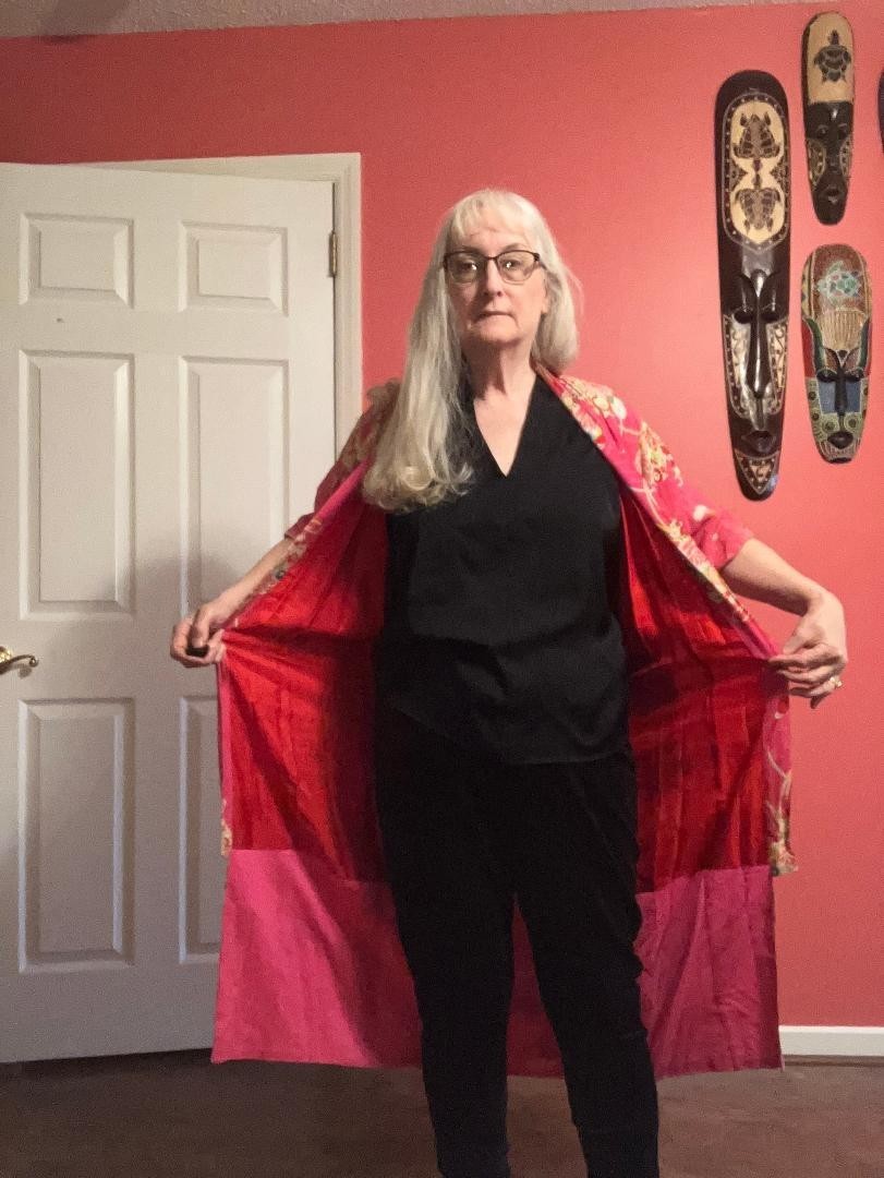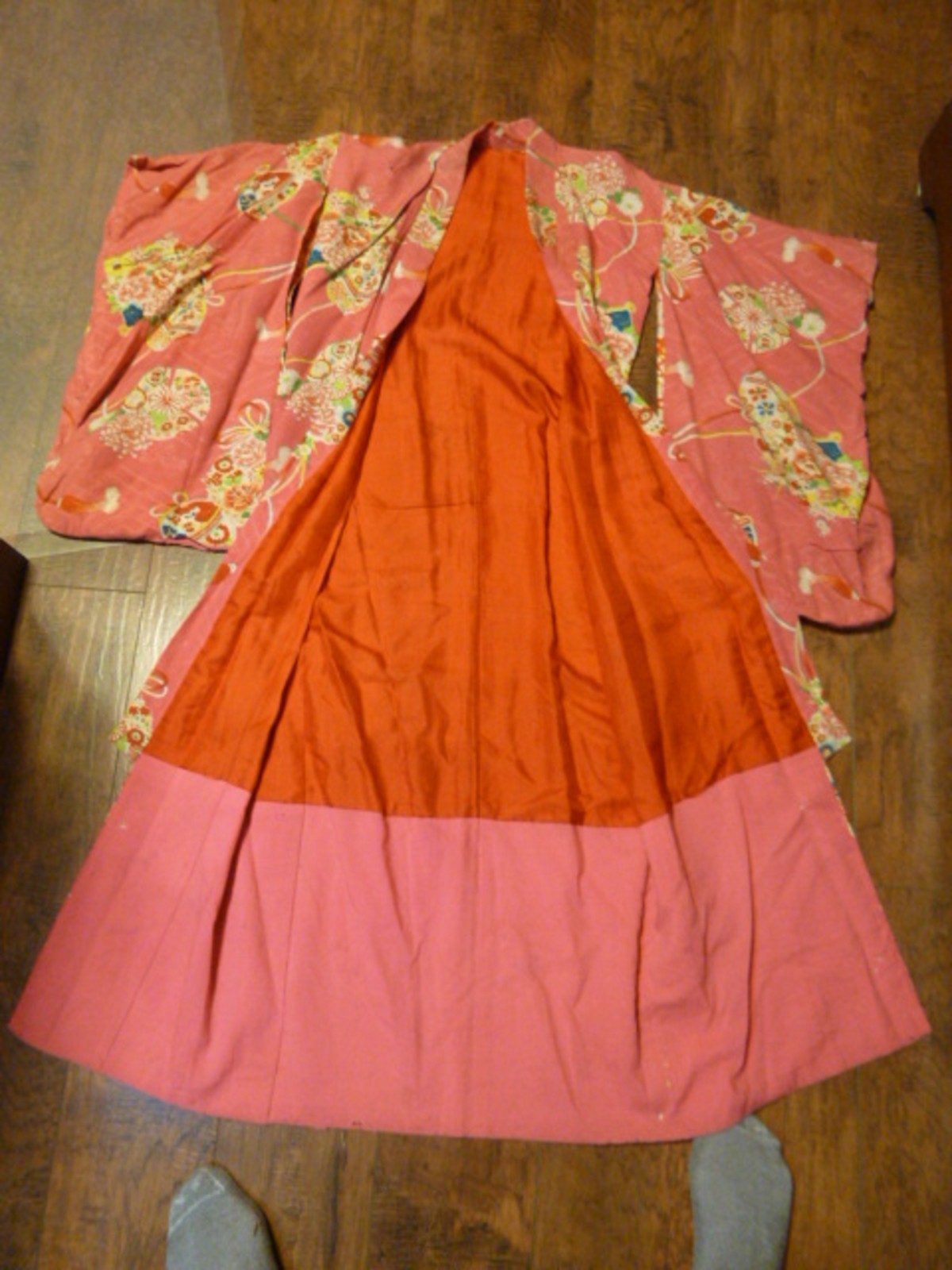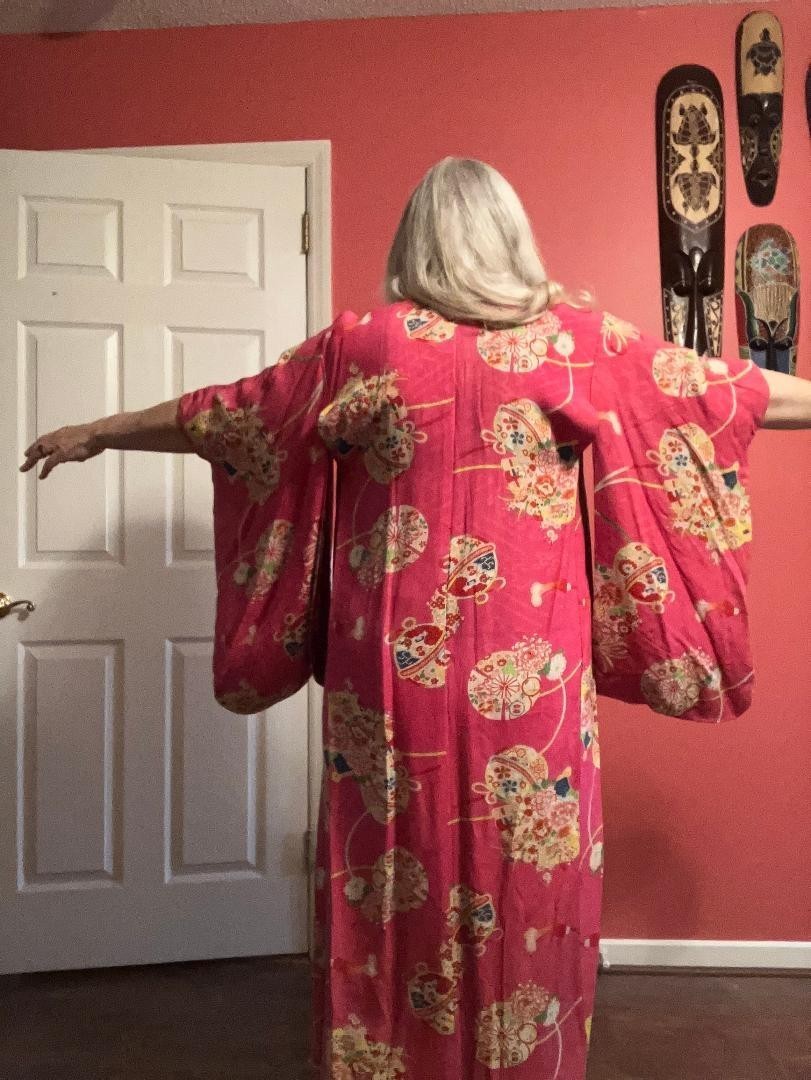 (Internal #CL-KIM-8) This is a beautiful vintage dark pink long kimono with floral and round designs; 3/4 lining in red, 1/4 in dark pink; several possible moth holes front right shoulder and upper lining (small); one small stain left lapel; believe silk
